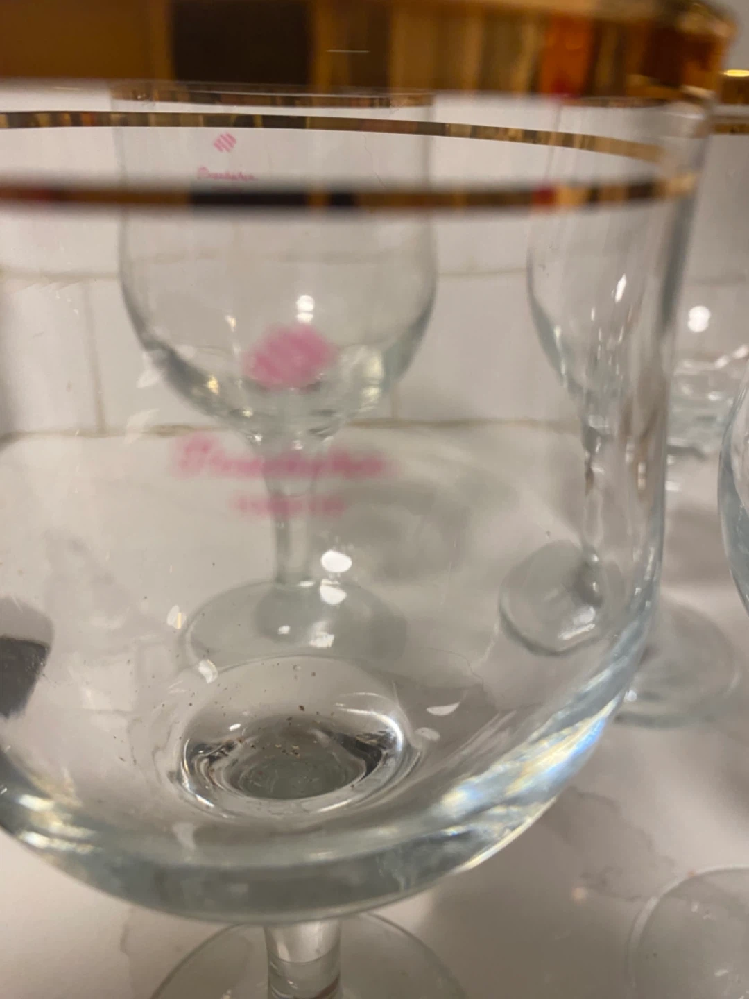 Selling a set of 4 Pasabahce wine glasses with a lovely gold rim. They're in great shape and would be perfect for entertaining or just enjoying a glass of wine at home! They are clear glass with a gold rim.