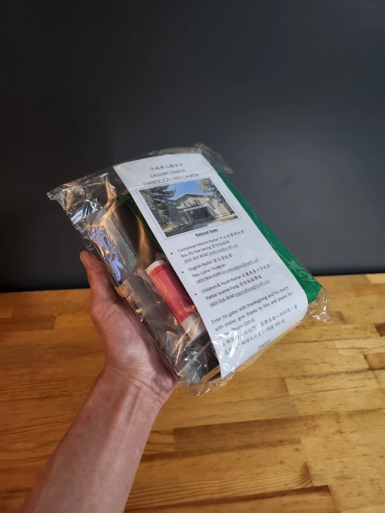 Gift bundle from The Calgary Chinese Evangelical Free Church. It includes a bag along with some other small items inside.