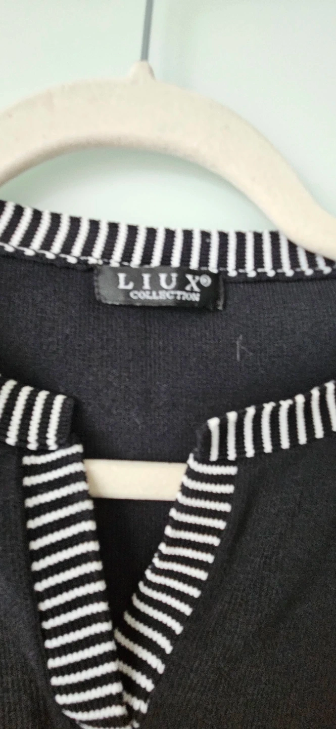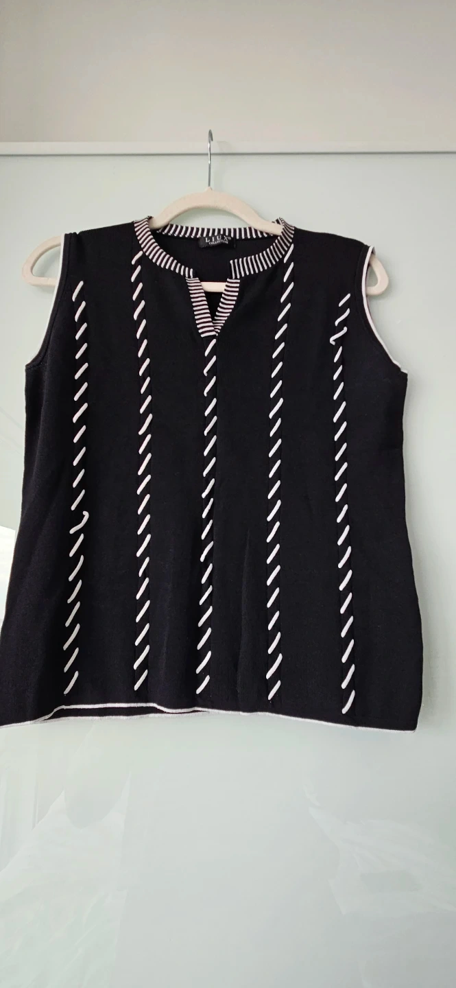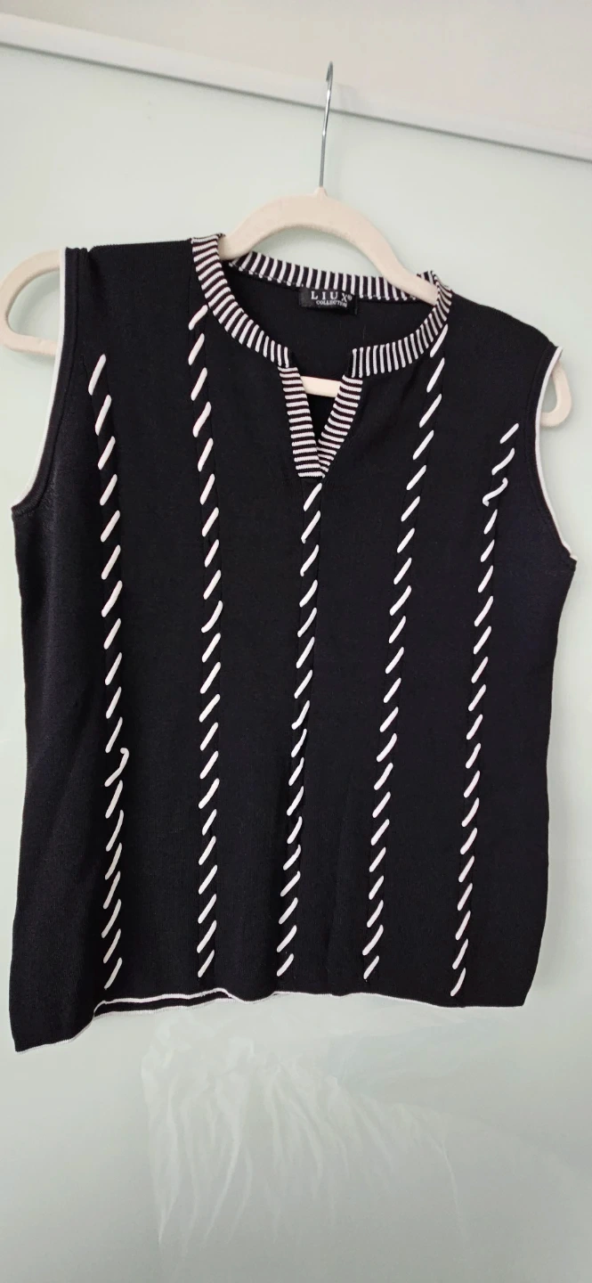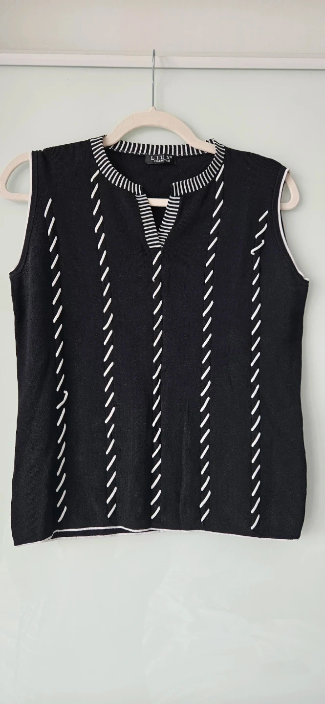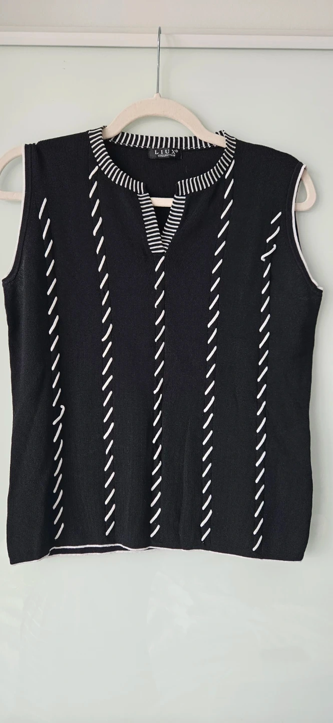 Stylish sleeveless sweater / top from LIUX Collection! It is a size medium. It features a unique black and white design that's perfect for layering or wearing on its own. The material feels soft and comfortable, making it a great addition to your wardrobe.