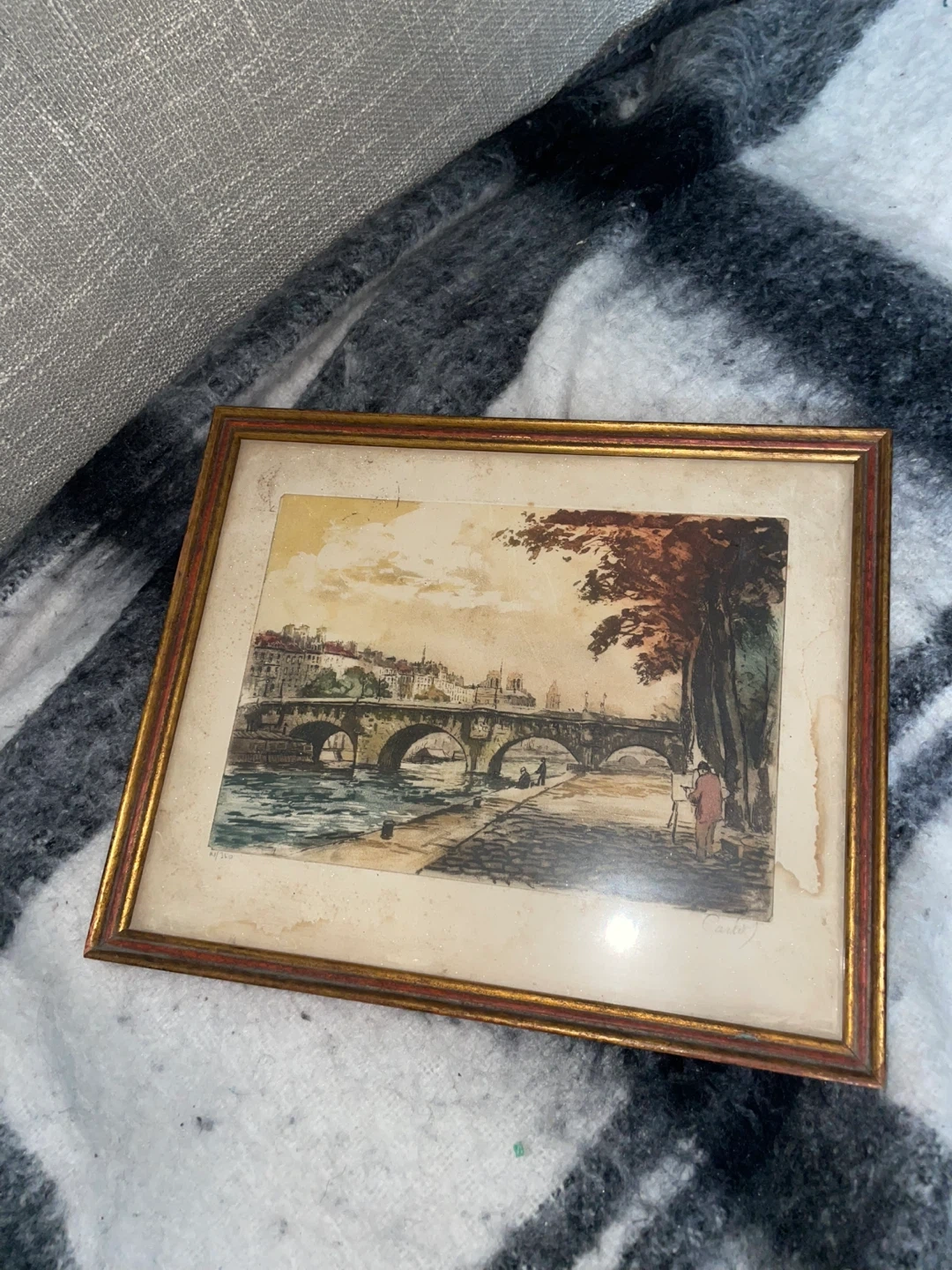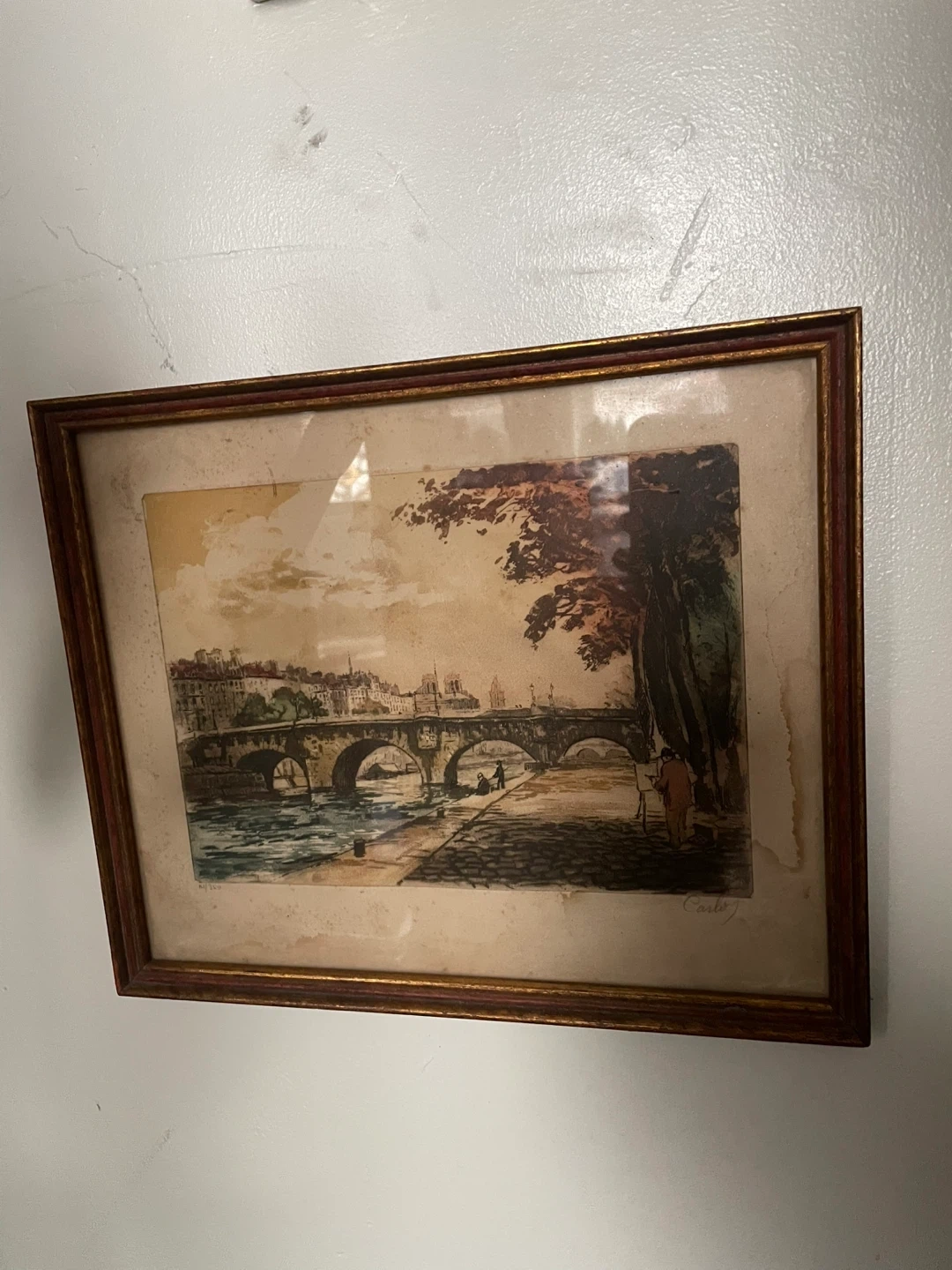 Here's a vintage framed print featuring a charming scene of a bridge in Paris! It's got a lovely, classic look that would add a touch of elegance to any room. The frame has a gold and red tone. Perfect for adding a bit of Parisian flair to your home decor. Only selling because I’m moving countries.