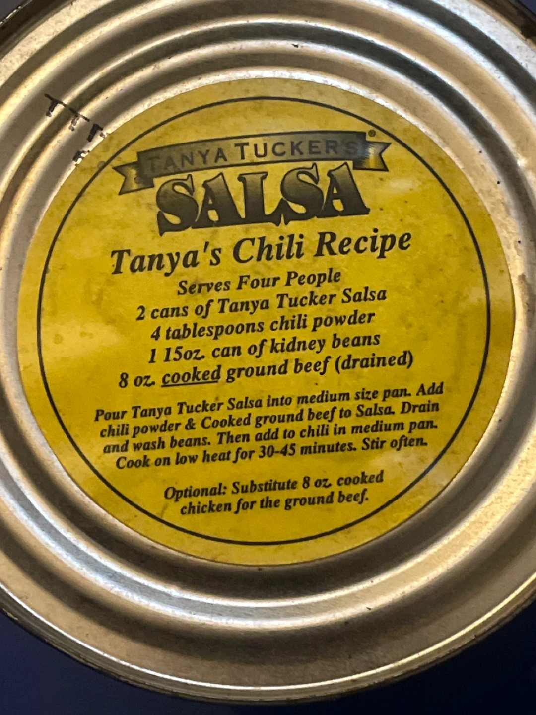 Selling a can of Tanya Tucker's Salsa, Mild flavour. This is a 28 oz (1 lb 12 oz) can. Perfect for adding a bit of country flair to your next meal or trying out Tanya's Chili Recipe on the lid!