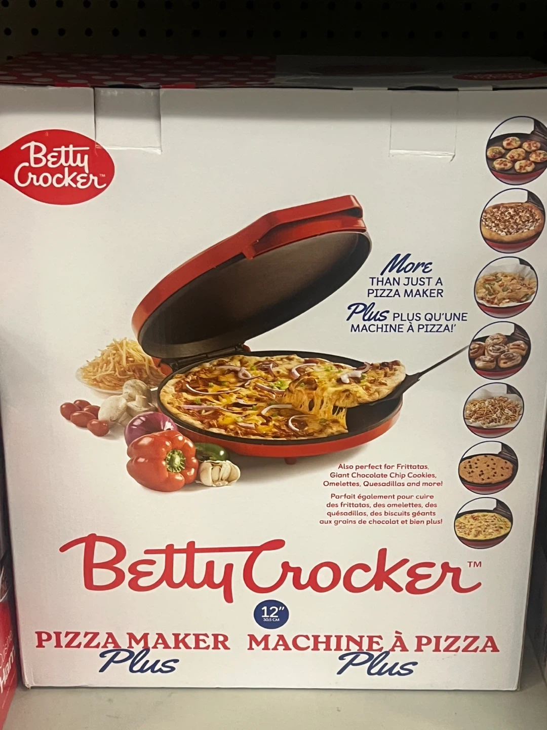Selling a Betty Crocker 12-inch pizza maker! It's in great condition and ready to make some delicious pizzas, frittatas, giant chocolate chip cookies, and more. It’s perfect for quick meals without turning on your oven. Compact for easy storage too