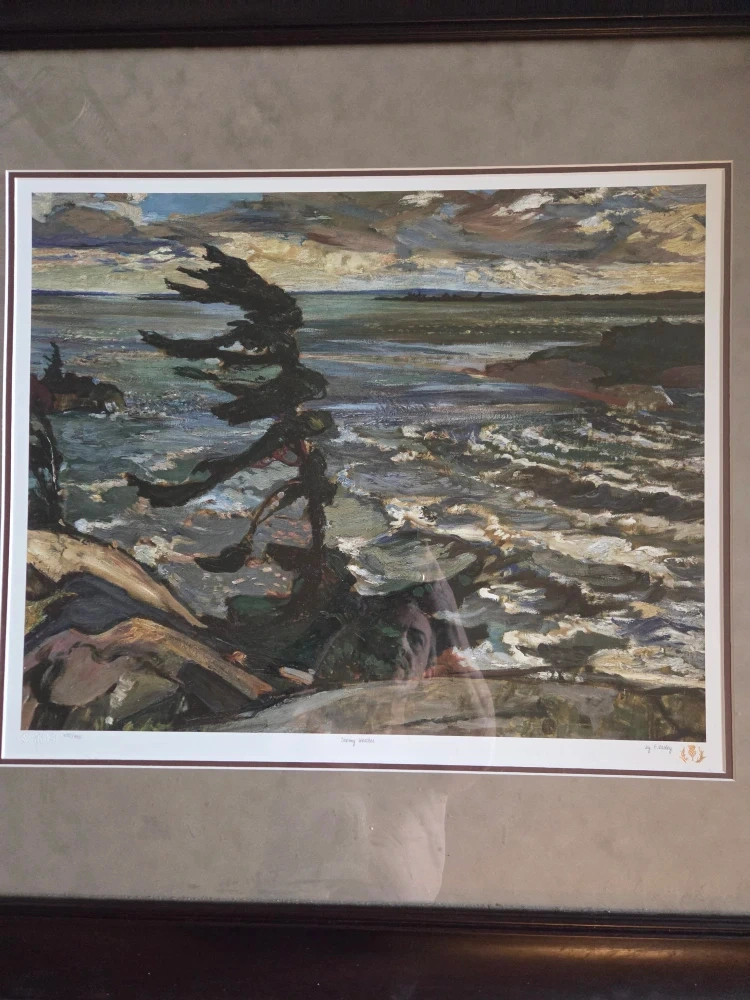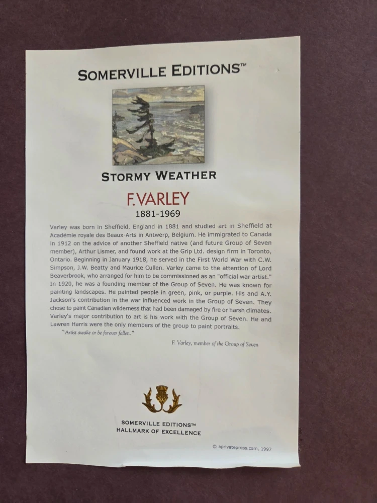 Selling a framed print of F. Varley's 'Stormy Weather' from Somerville Editions. It's a beautiful piece that captures the essence of the Canadian wilderness, known for its depiction of landscapes damaged by fire or harsh climates. A lovely addition to any art collection!