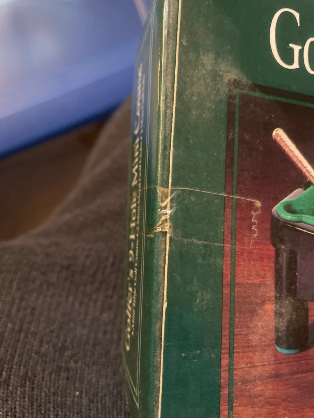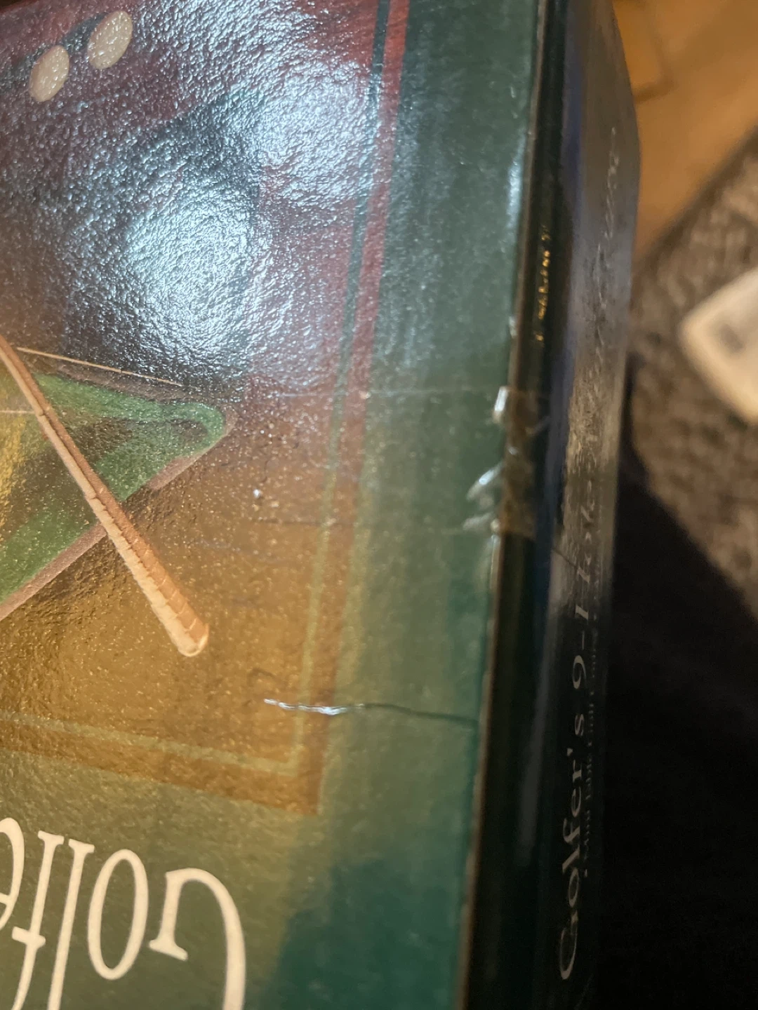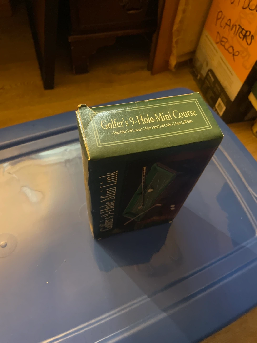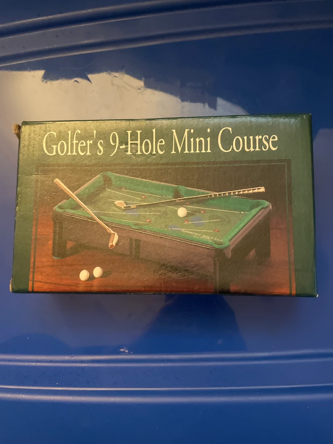 The item shown in the image is a "Golfer's 9-Hole Mini Course", which is a novelty desktop or tabletop game. It's essentially a miniature putting green where players use a small club to hit balls into holes, often resembling a billiard/pool table setup as depicted on the box.