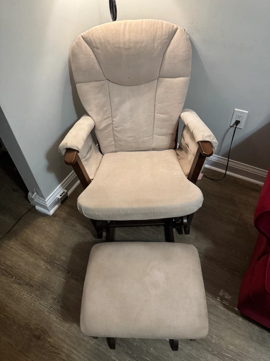 I'm selling a comfy glider rocking chair with an ottoman. It's in great condition and perfect for relaxing. The chair is a neutral beige colour and has wooden armrests. A great addition to any living room or nursery!