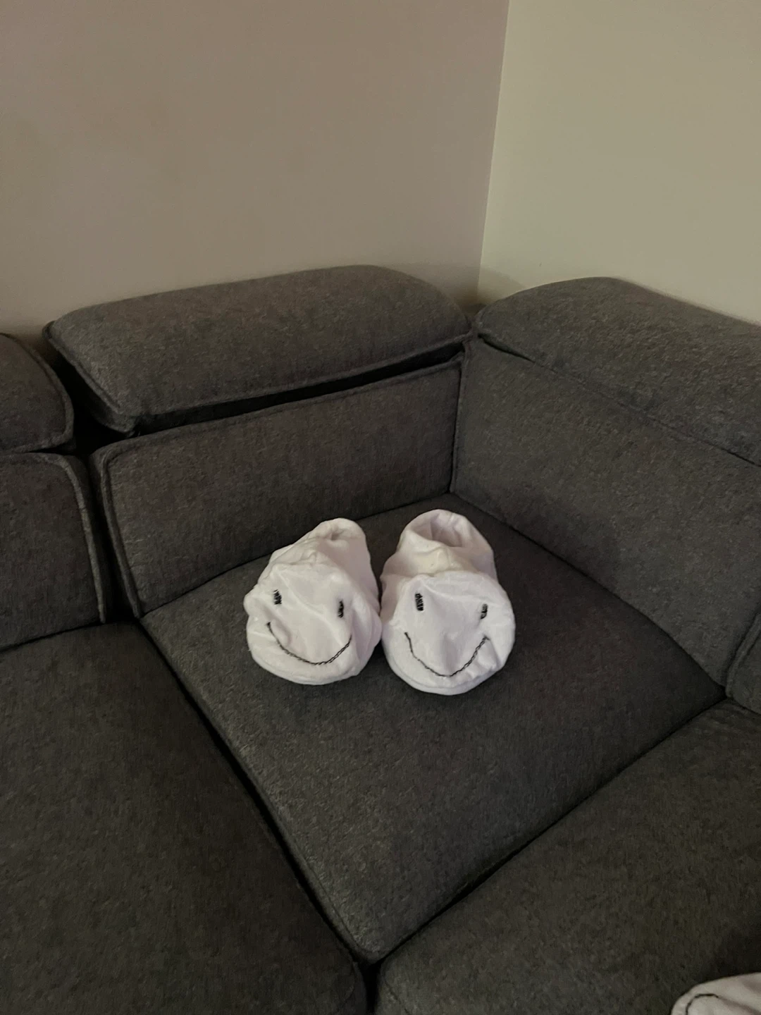 Check out these adorable smiley face slippers! They're super soft and comfy, perfect for keeping your feet warm on chilly days. They're in great condition and ready for a new home!