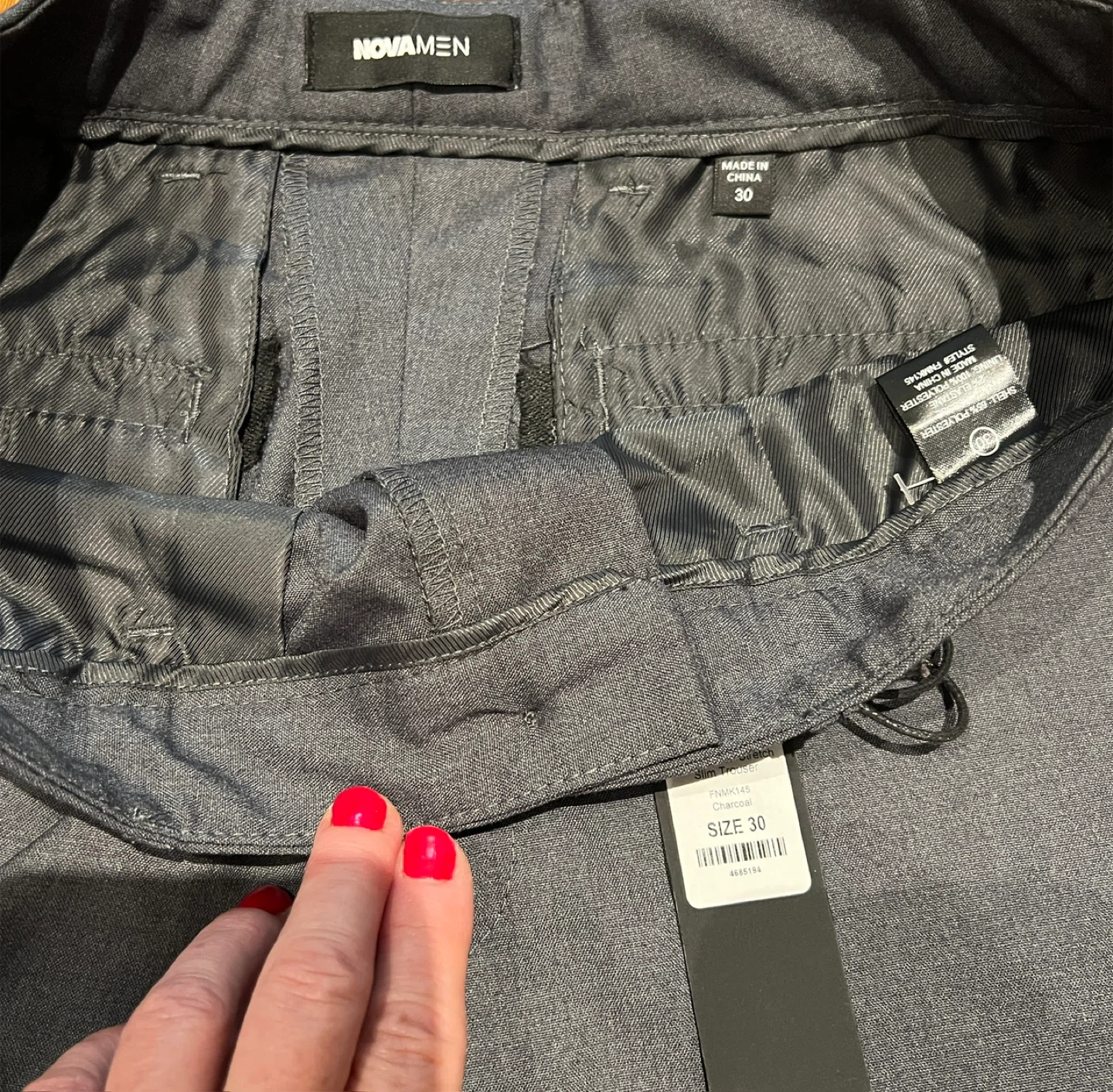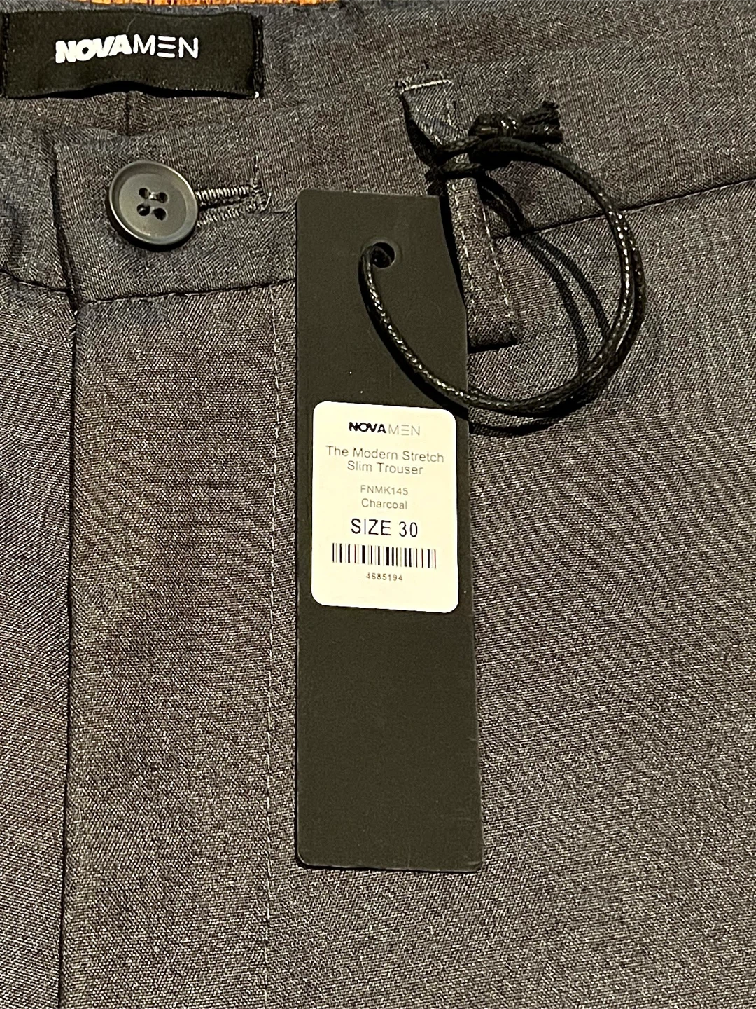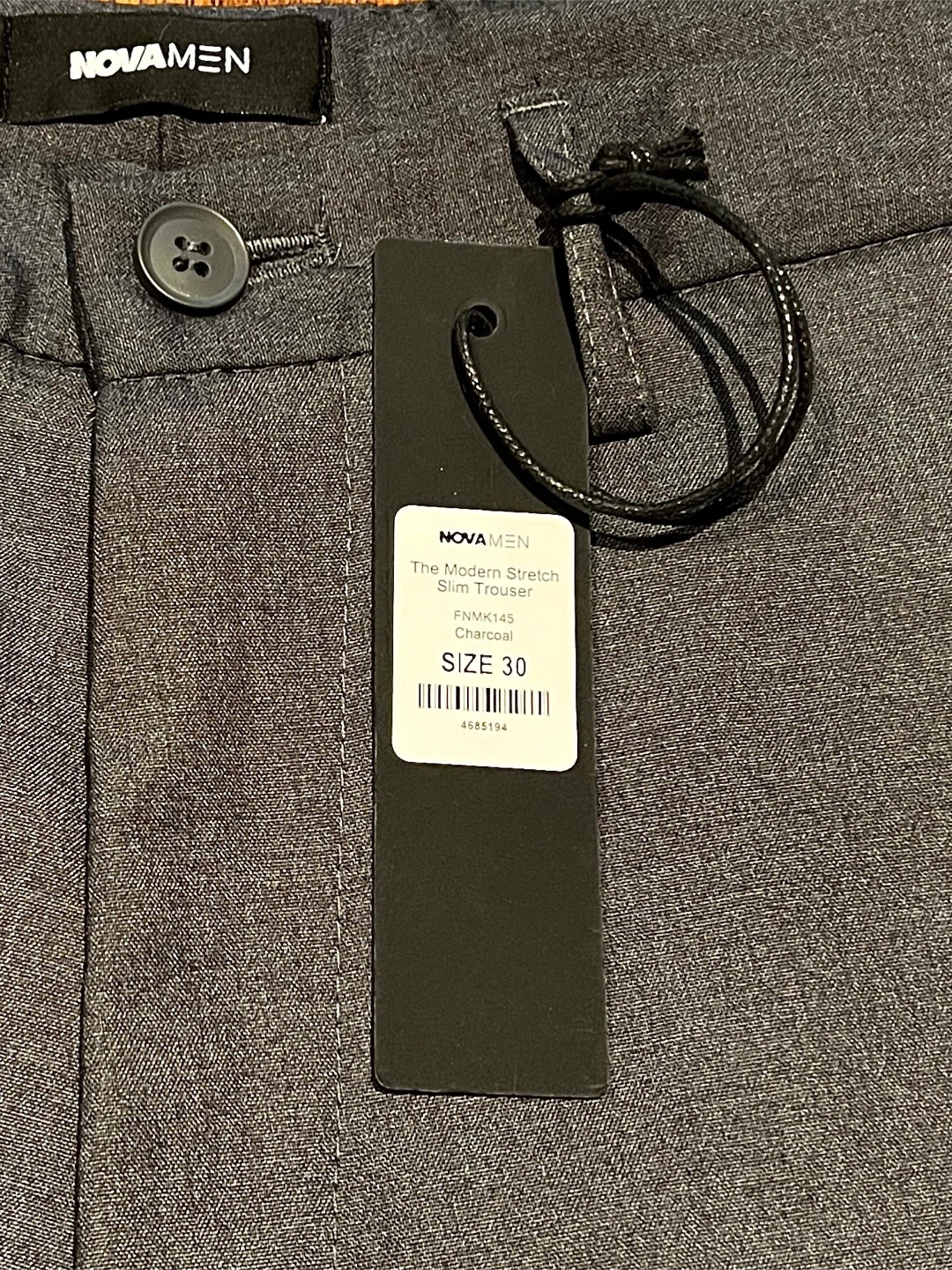 Selling a pair of NOVAMEN The Modern Stretch Slim Trousers in size 30. They are charcoal grey and made of 65% polyester, 33% viscose, and 2% elastane. The lining is 100% polyester. The style number is FNMK145