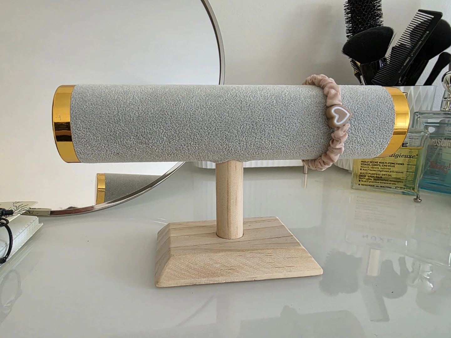 Selling a grey jewellery stand, perfect for displaying your favourite bracelets or scrunchies! It has a light wood base and gold accents on the ends.