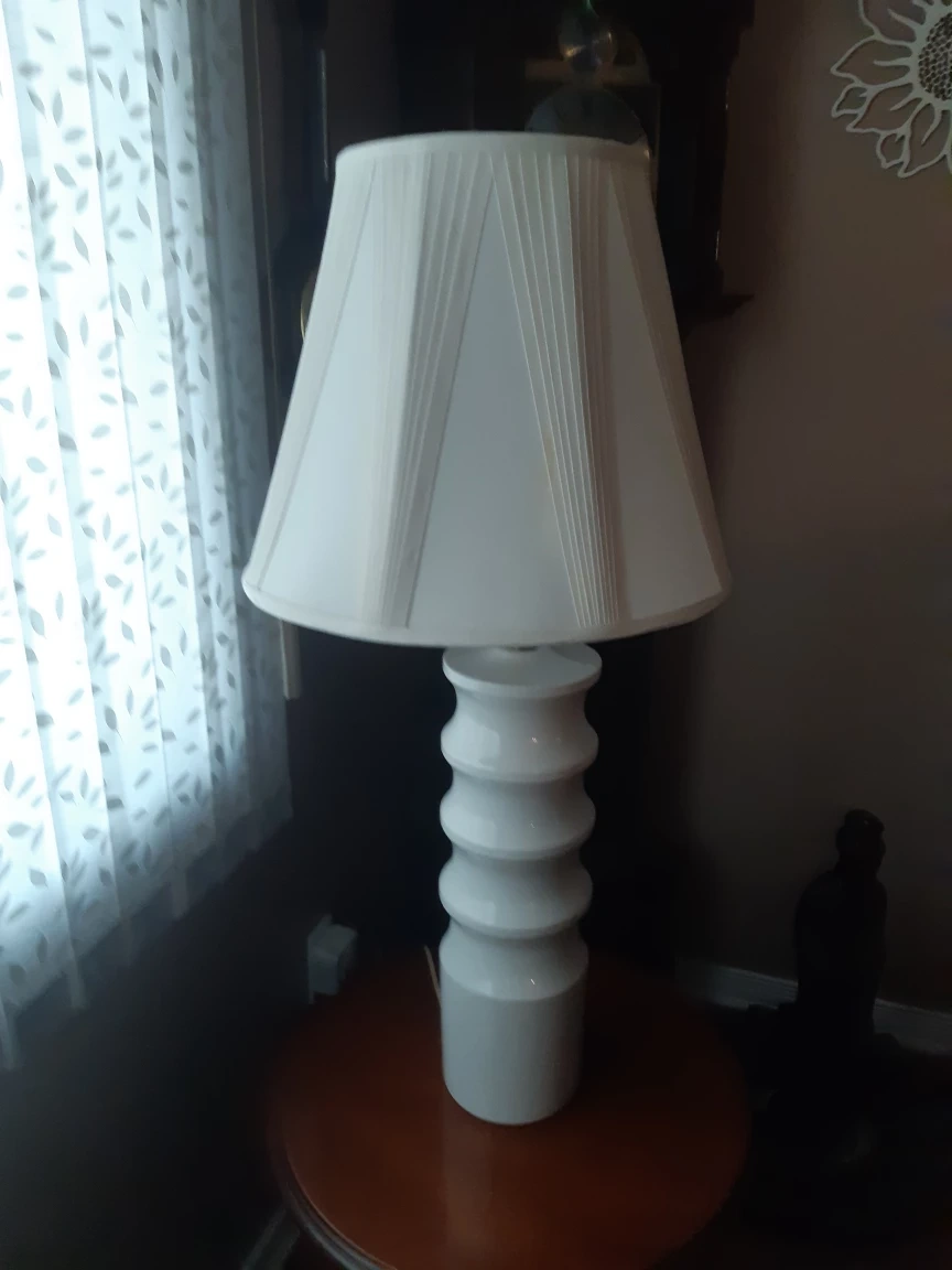 Selling a lovely white ceramic table lamp! It's in great condition and would look wonderful in any room. The base has a unique ribbed design, and the shade is a classic pleated style.
