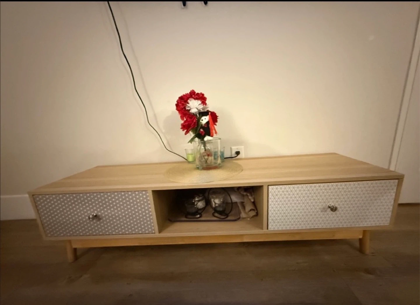 Selling a light wood TV stand! It features two drawers with patterned fronts and an open shelf in the middle. It's in great condition and would be perfect for a living room or entertainment area