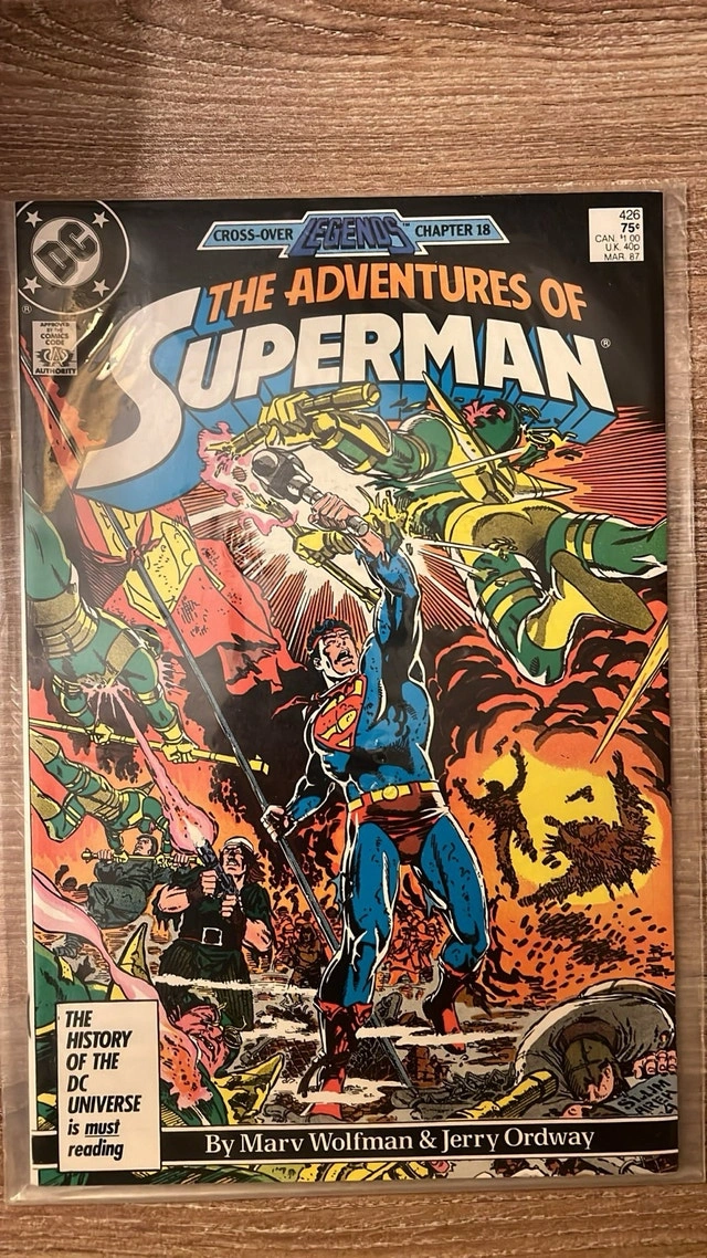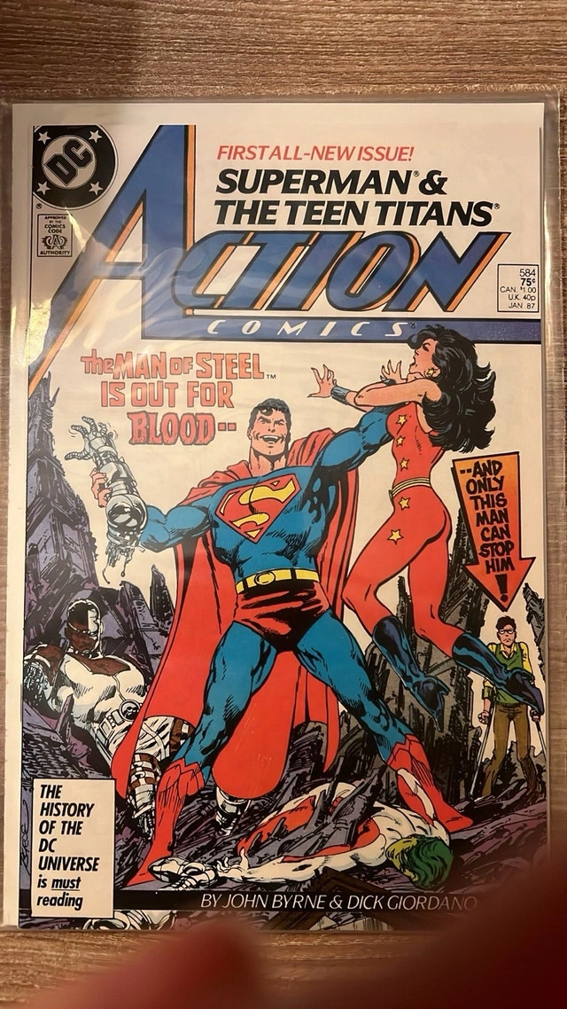 A fantastic collection of Bronze-to-Copper Age Superman comics from the legendary John Byrne, Terry Austin, Marv Wolfman, and Jerry Ordway creative teams. These issues cover Byrne’s reboot era post-Crisis on Infinite Earths — one of the most influential periods in Superman’s history. All comics are bagged/boarded and in nice collectible condition. Included Comics 1. The Man of Steel #2 (1986) • A key issue from Byrne’s 6-part mini-series rebooting Superman’s origin for a new generation. • First Byrne-era appearance of Lois Lane. • Major foundational story for modern Superman continuity. 2. Superman #1 (Jan 1987) • “It’s Your First Issue… and it could be your last!” • The first issue of Byrne’s ongoing Superman title. • Features the Menace of the Energy Parasite. • Highly desirable for fans of the Byrne era. 3. Superman #3 (Mar 1987) • A Legends crossover issue (Chapter 17). • Features Darkseid manipulating events from the shadows. • Part of DC’s major post-Crisis restructuring storyline. 4. Superman #2 (Feb 1987) • “The Secret Revealed!” • Major story in which Clark Kent’s identity is nearly exposed. • Great cover featuring Lex Luthor uncovering the truth. 5. The Adventures of Superman #425 (Feb 1987) • Part of the new numbering following the post-Crisis relaunch. • Written by Wolfman & Ordway. • Superman faces moral challenges as the new world around him changes. 6. The Adventures of Superman #426 (Mar 1987) • “Above the Blazing Fire-Pits!” • A tie-in to the Legends event (Chapter 18). • Features Apokolips and the classic Kirby characters. 7. Action Comics #584 (Jan 1987) • Superman teams up with the Teen Titans. • Giant first issue after the post-Crisis renumbering shake-up. 8. Action Comics #586 (Mar 1987) • “Orion vs. Superman — Champion of Apokolips!” • A high-action Fourth World crossover issue starring Orion & the New Gods. • Part of Legends Chapter 19. Why This Bundle Is Special • Nearly all issues are key parts of the 1986–87 Superman reboot. • Written by superstar creators (John Byrne, Marv Wolfman), with iconic art by Terry Austin & Jerry Ordway. • Includes early appearances, identity-themed stories, and major Legends crossover issues. • Great for collectors starting a Superman run or Byrne-era fans.