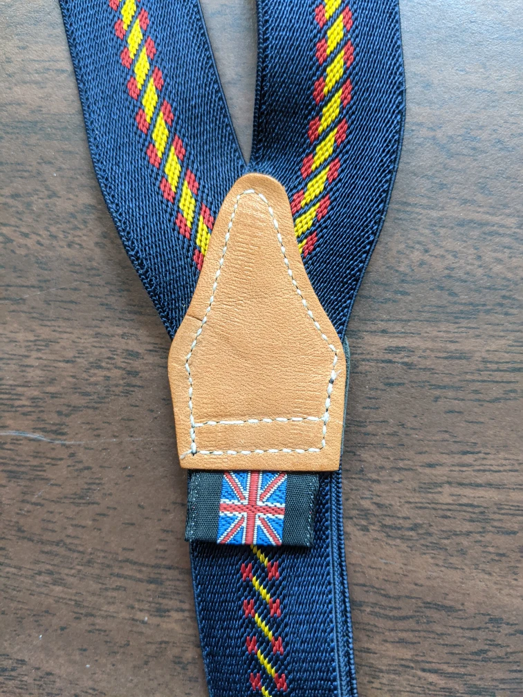 Classic navy blue suspenders or braces with a subtle Union Jack detail. They're in great shape and ready to add a touch of British flair to your wardrobe. Made in England