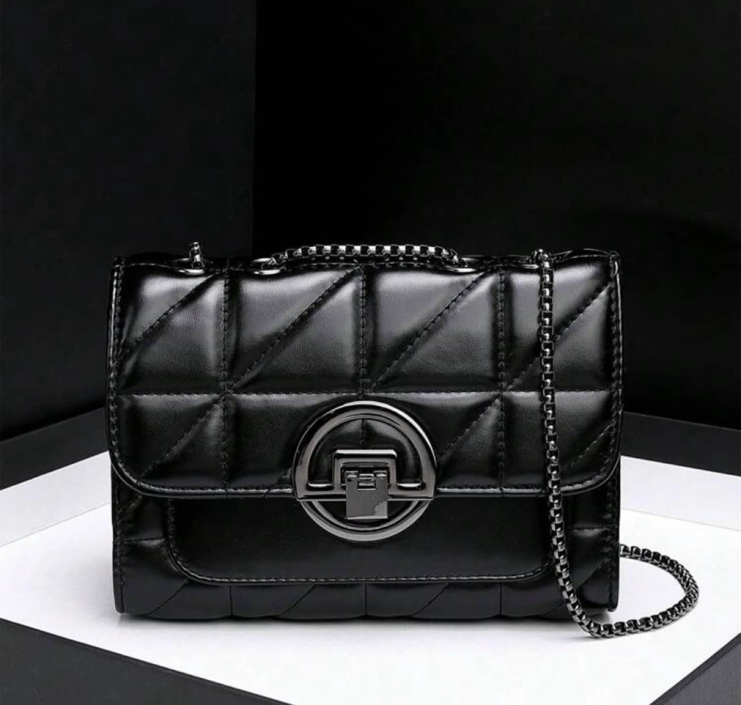 This is a stylish black quilted bag with a chain strap. It's in great condition and perfect for everyday use or a night out. The bag features a unique circular clasp and a classic quilted design.