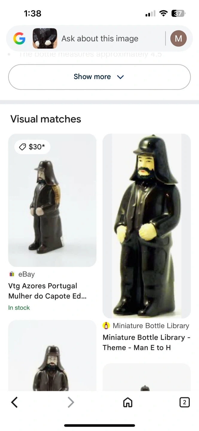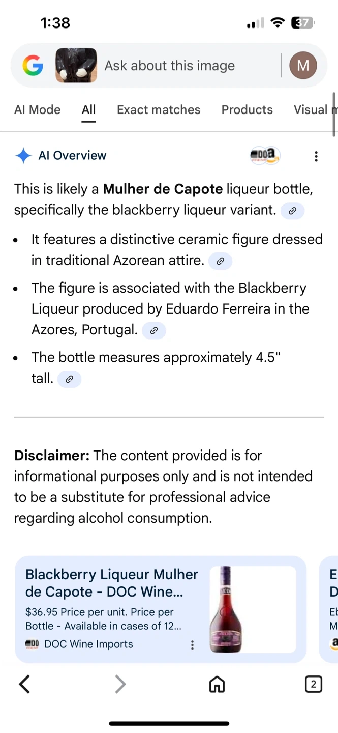 Selling a vintage Mulher de Capote liqueur bottle from the Azores, Portugal. It's a unique ceramic bottle depicting a woman in traditional Azorean dress. The bottle is approximately 4.5 inches tall and (DID) contains fruit-flavored liqueur, such as blackberry or passion fruit. These bottles come empty