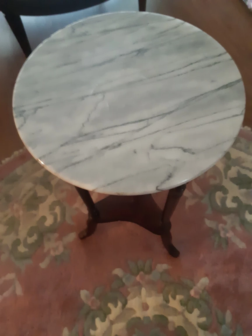Selling a lovely marble top accent table! It features a dark wood base and a round marble top with a classic design. It would be a great addition to any living room or bedroom as a side table