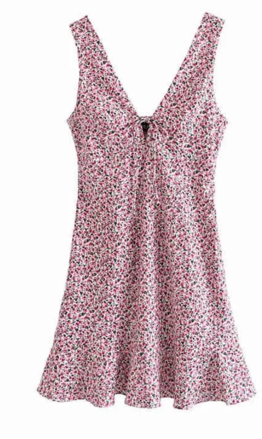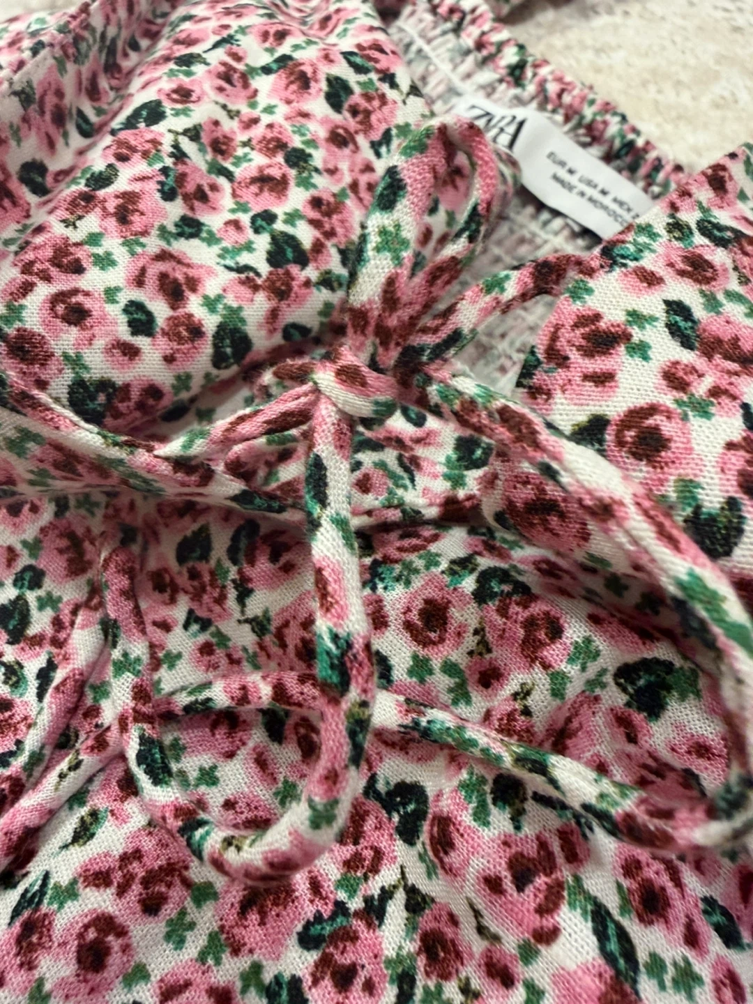 Selling a cute Zara floral print mini dress! It's perfect for summer and in great condition. The dress features a V-neck and a tie detail at the bust. The material is lightweight and comfortable. Size M