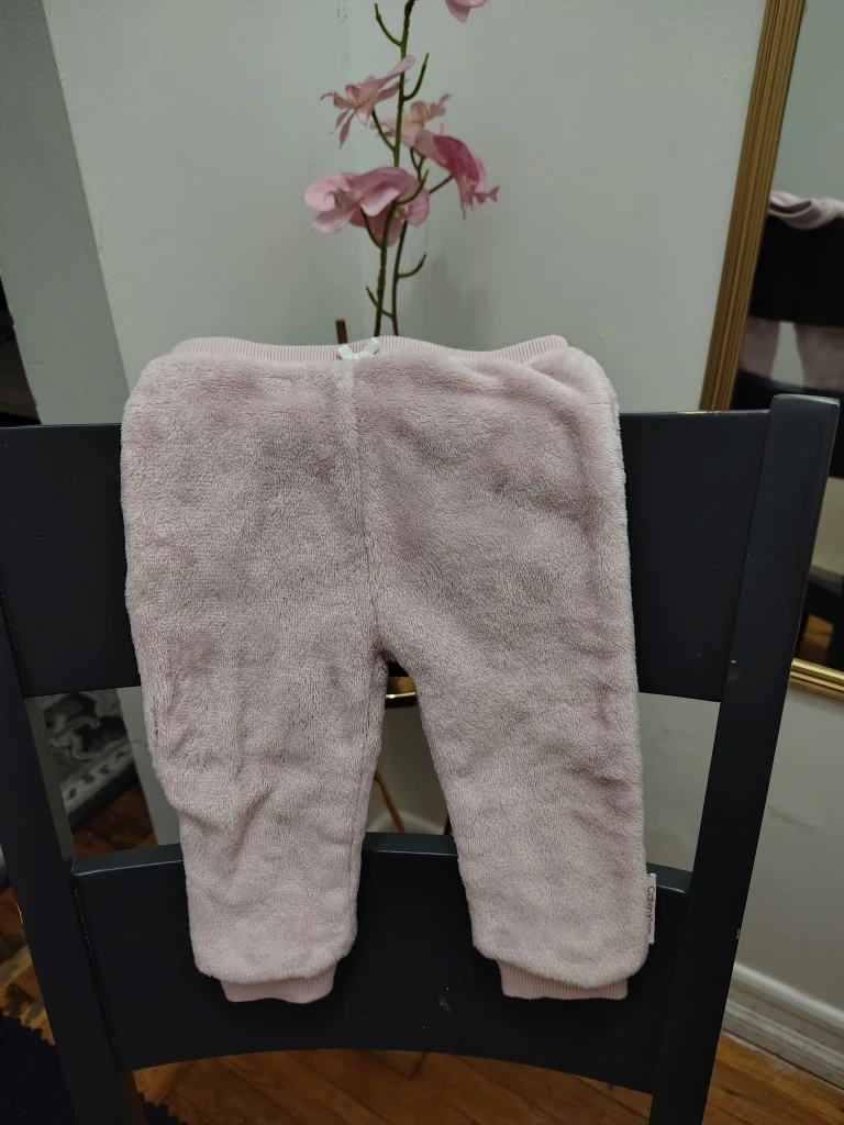 These baby pink pants are made of a soft, fuzzy material, perfect for keeping your little one cozy