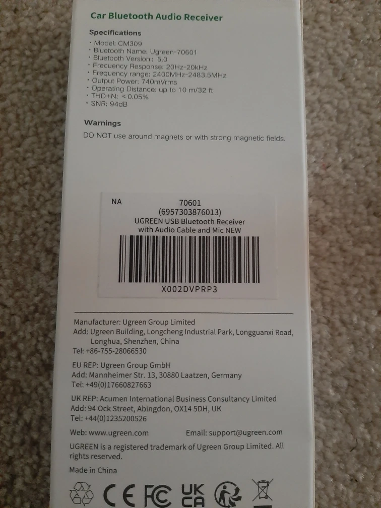 Selling a brand new UGREEN USB Bluetooth Receiver with Audio Cable and Mic. The model number is 70601. It comes in its original box.