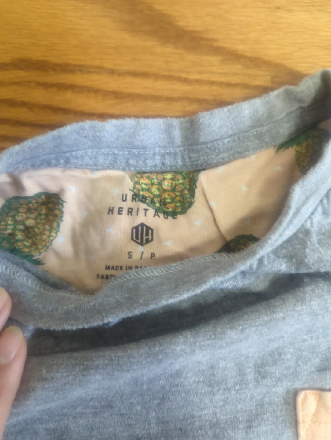 Giving away a cute Urban Heritage t-shirt in size S/P! It's a light grey colour with a fun pineapple print on the pocket and inside the collar and sleeves. Perfect for a casual day out!