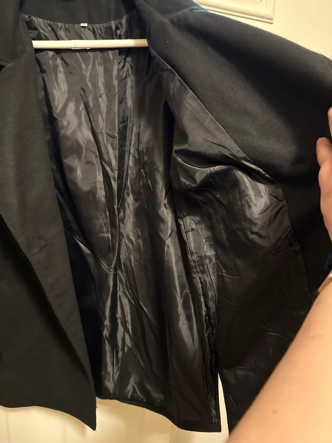 Selling a gently used black wool blend coat. Inside is a bit wrinkly but no tears or worn out spots. It's a classic double-breasted style with a smooth lining. Perfect for keeping warm on chilly days!