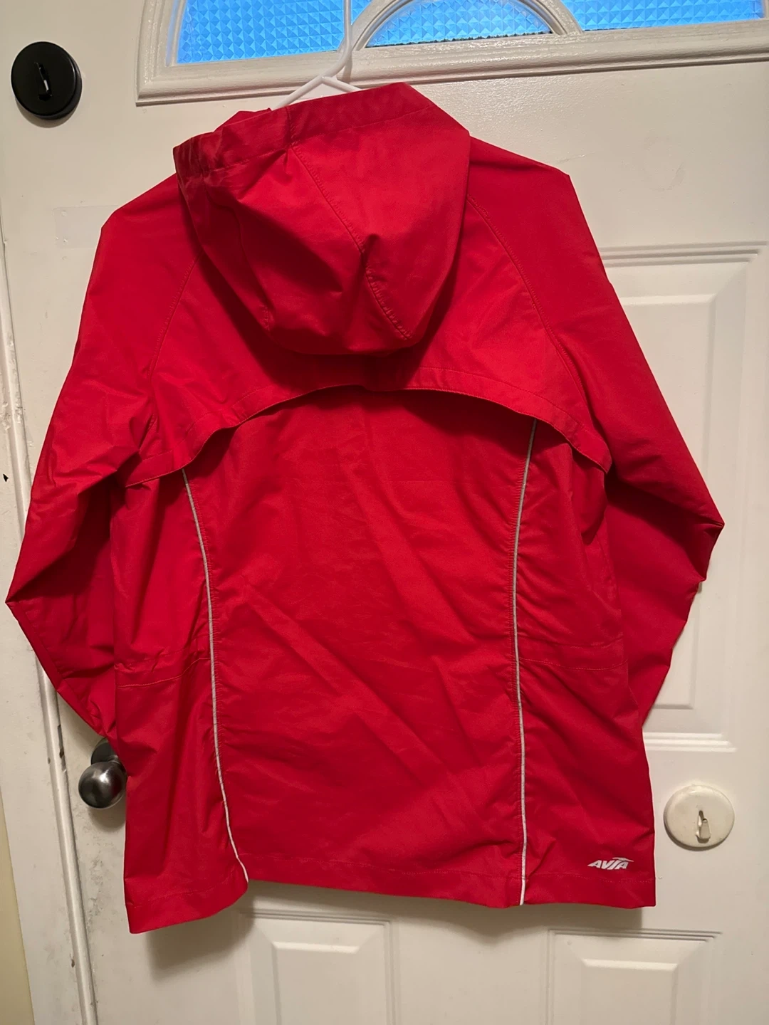 Here's a bright red active jacket from Avia! It's got a hood and is perfect for outdoor activities. The jacket features a full zipper and pockets for convenience.