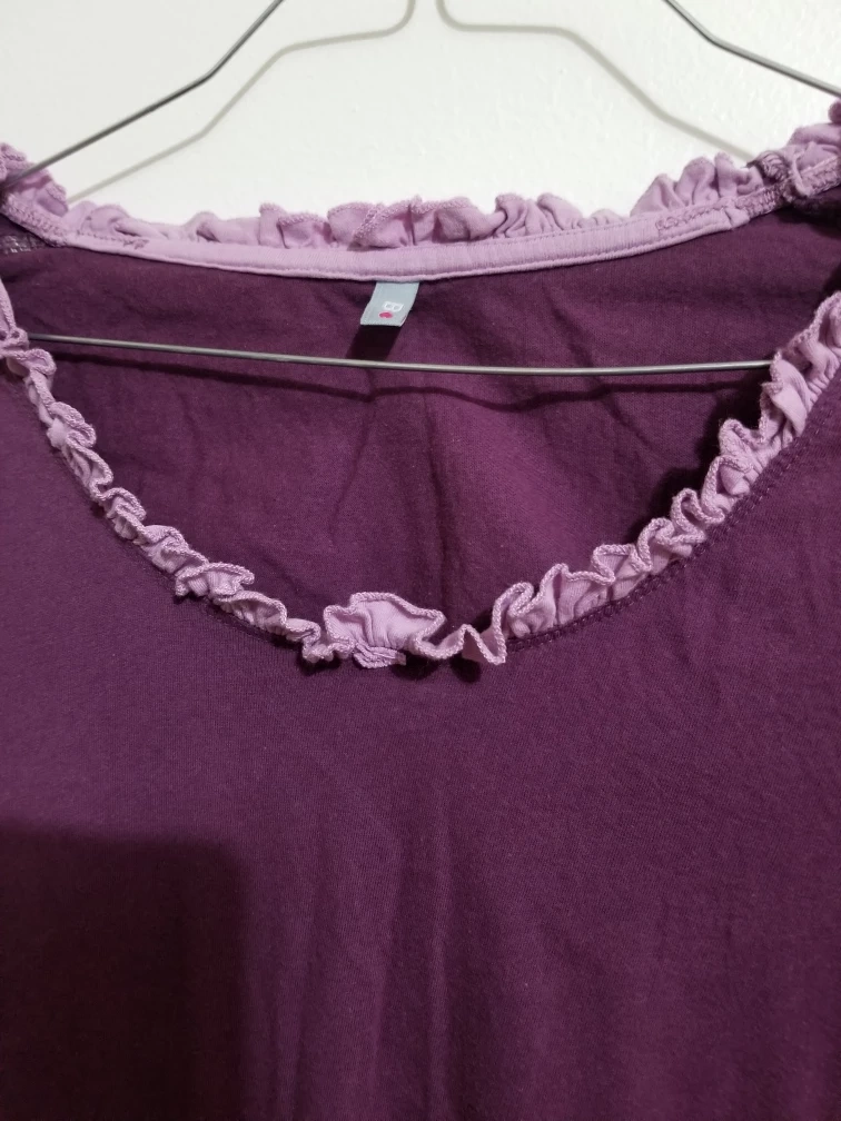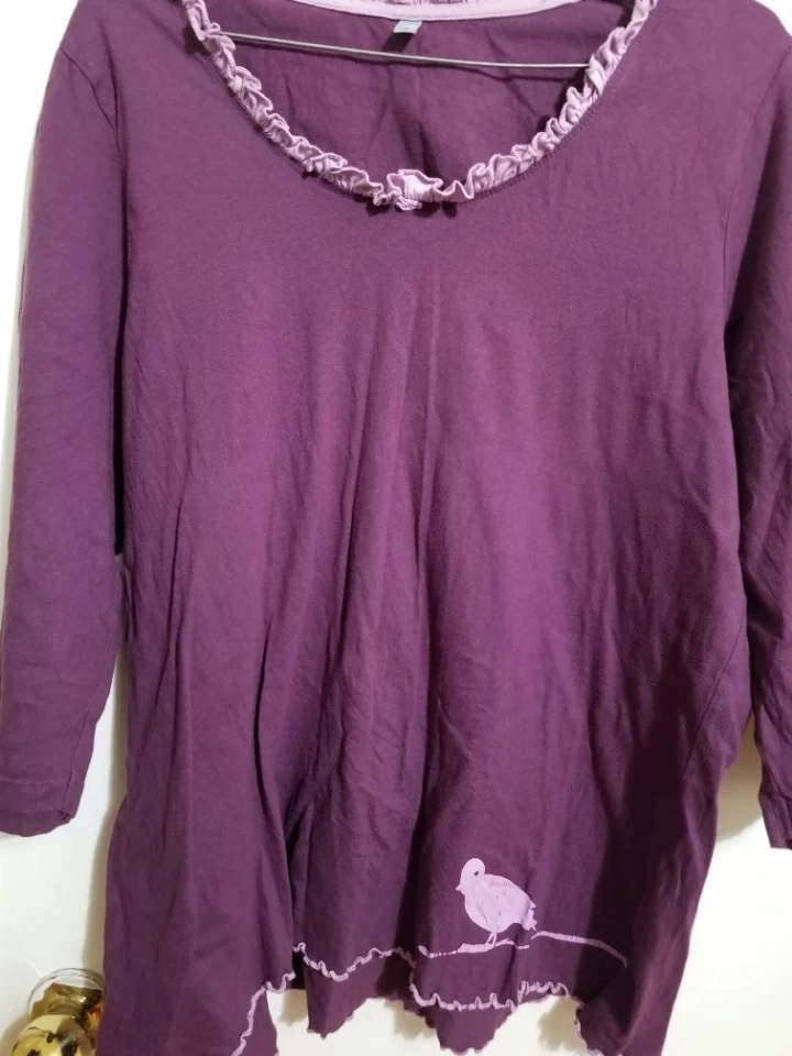 A cute purple tunic top with ruffled trim at the neckline and hem. It has a little bird design at the bottom. Perfect for adding a touch of whimsy to your wardrobe!