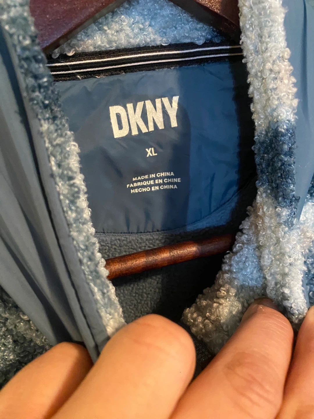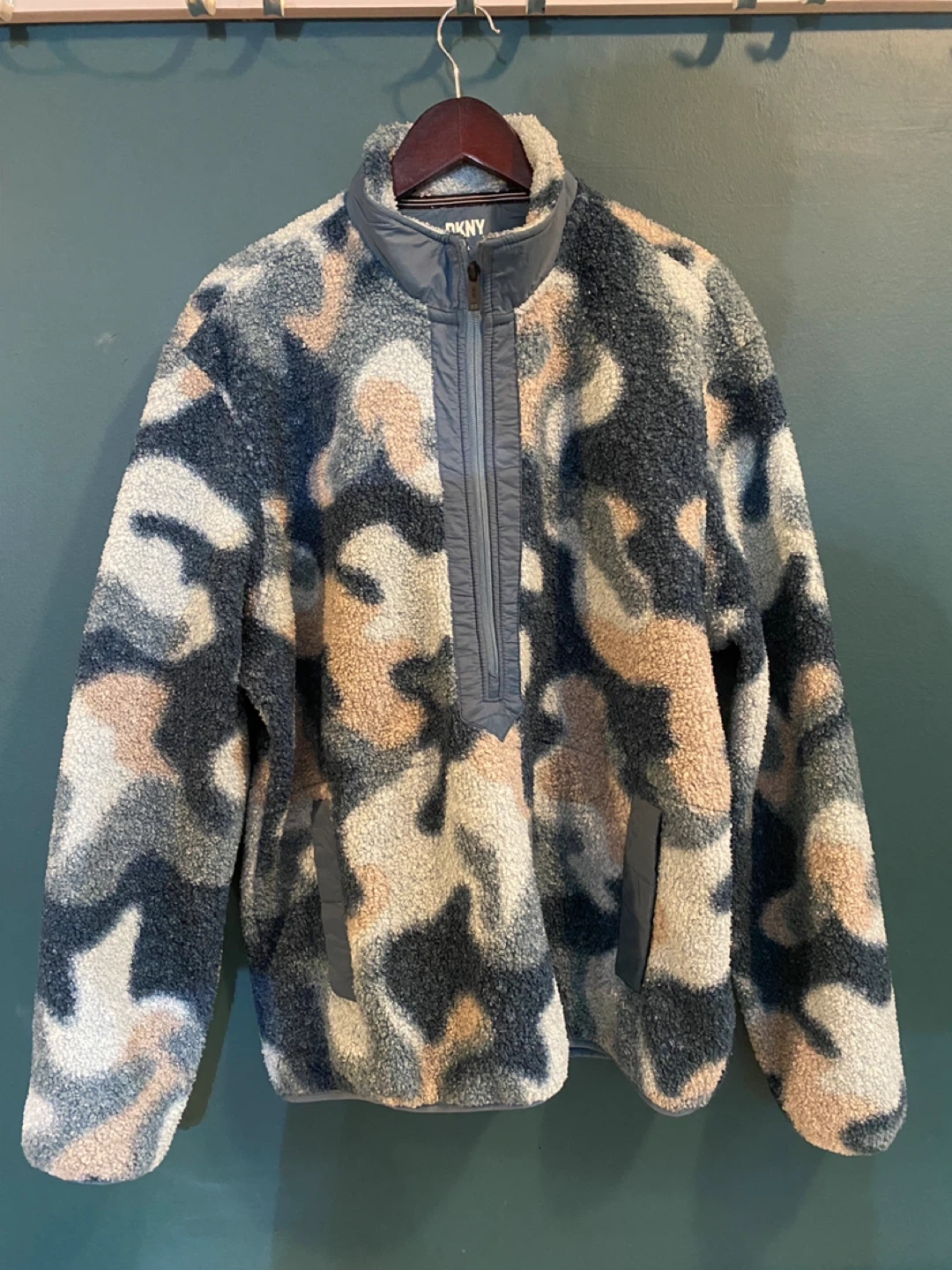 Cozy up in this DKNY fleece pullover! Features a cool camo pattern.