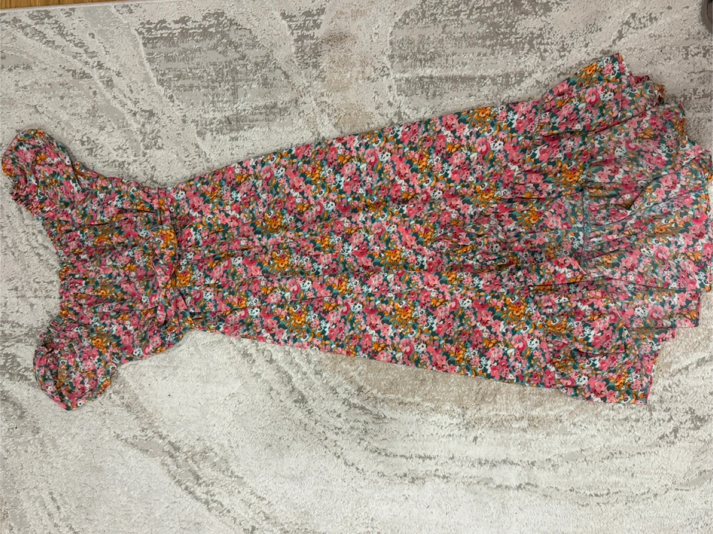 This is a Bar III floral print off-the-shoulder midi dress. It features a vibrant floral pattern and a flattering off-the-shoulder design. Perfect for a stylish and comfortable look! Size small, with a belt to tie around the waist.
