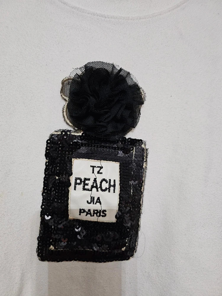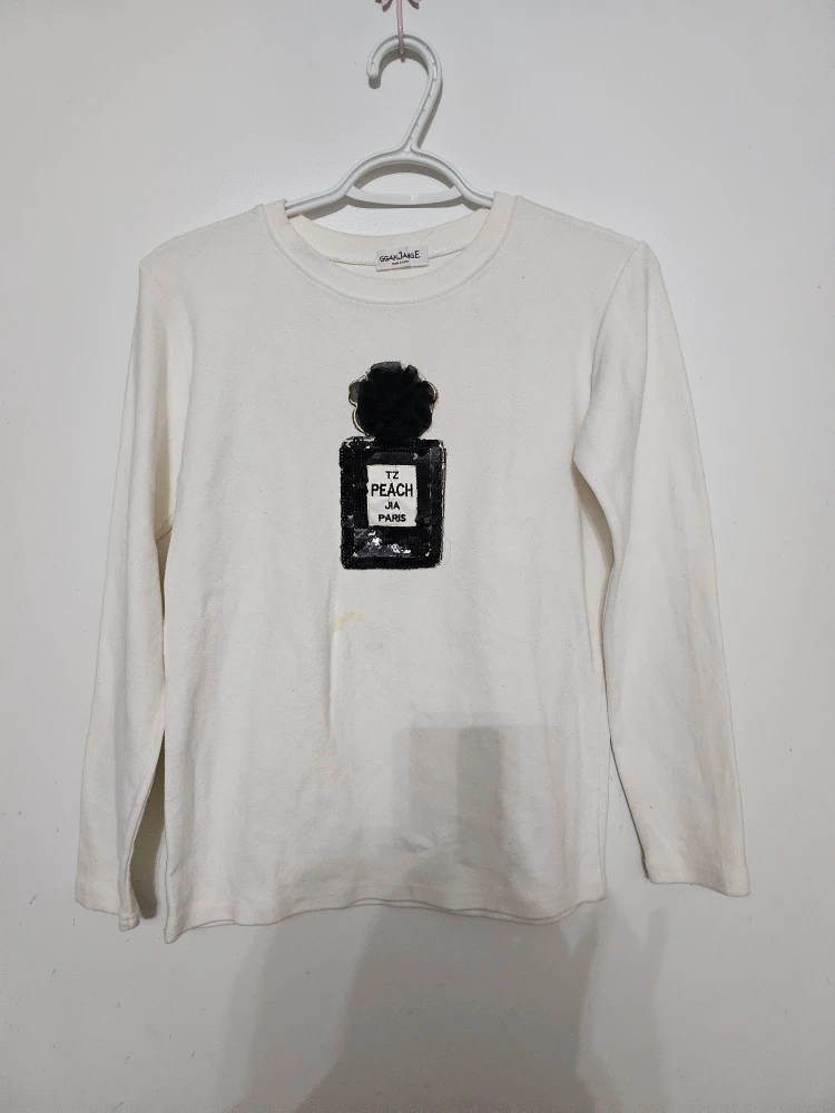 🤍🖤This is a Bean Pole Paris long-sleeved top in white. It has a unique design with a sequined perfume bottle on the front. It's in good condition and ready for a new wardrobe!
