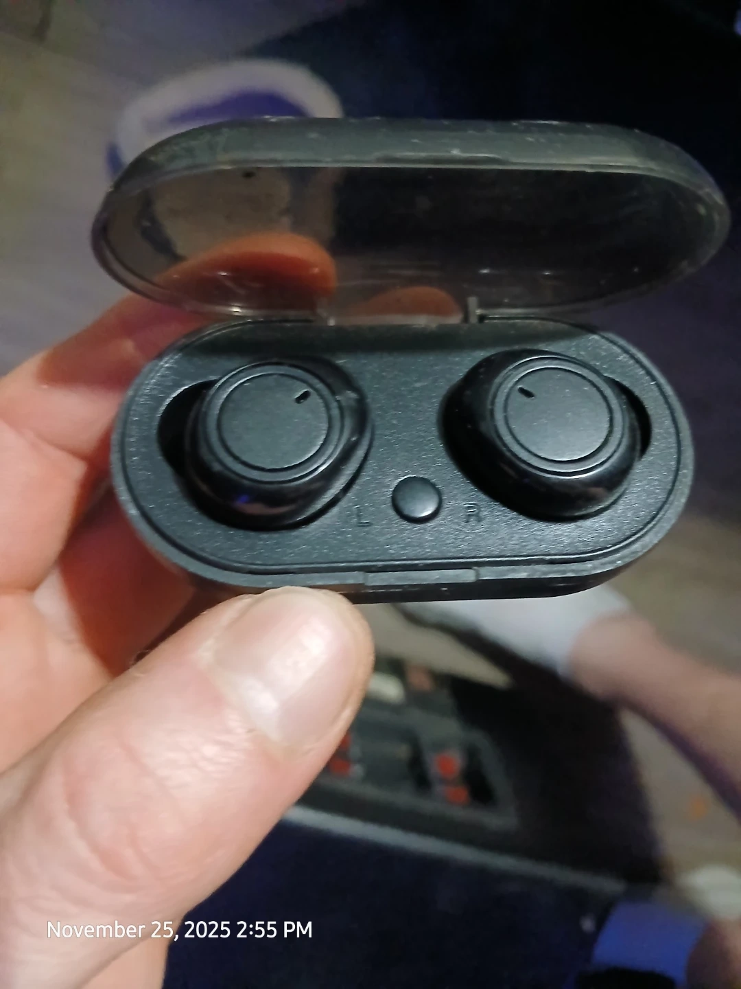 Selling a pair of black wireless earbuds with their charging case. They're in good condition and ready for a new owner! They are lightweight and portable for easy listening on the go
