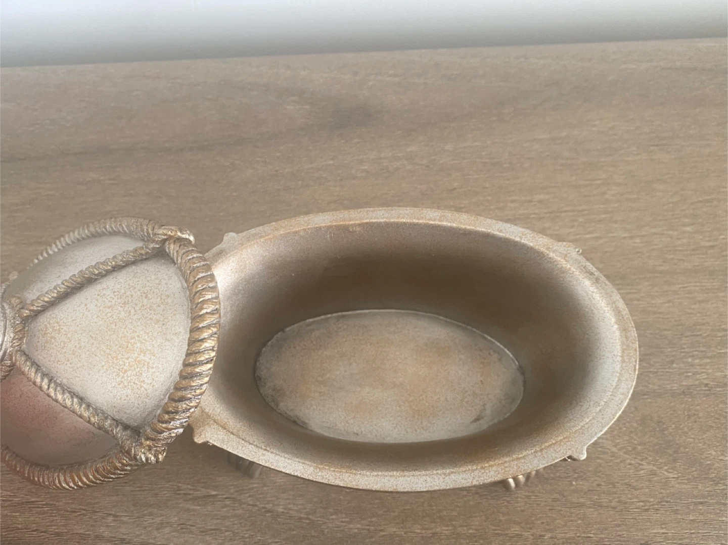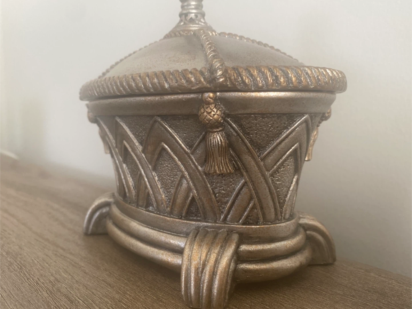 Selling a decorative covered box. It's in great shape and would look lovely on a shelf or table. The box has a metallic finish with intricate detailing. Measurements : 6x2 inches