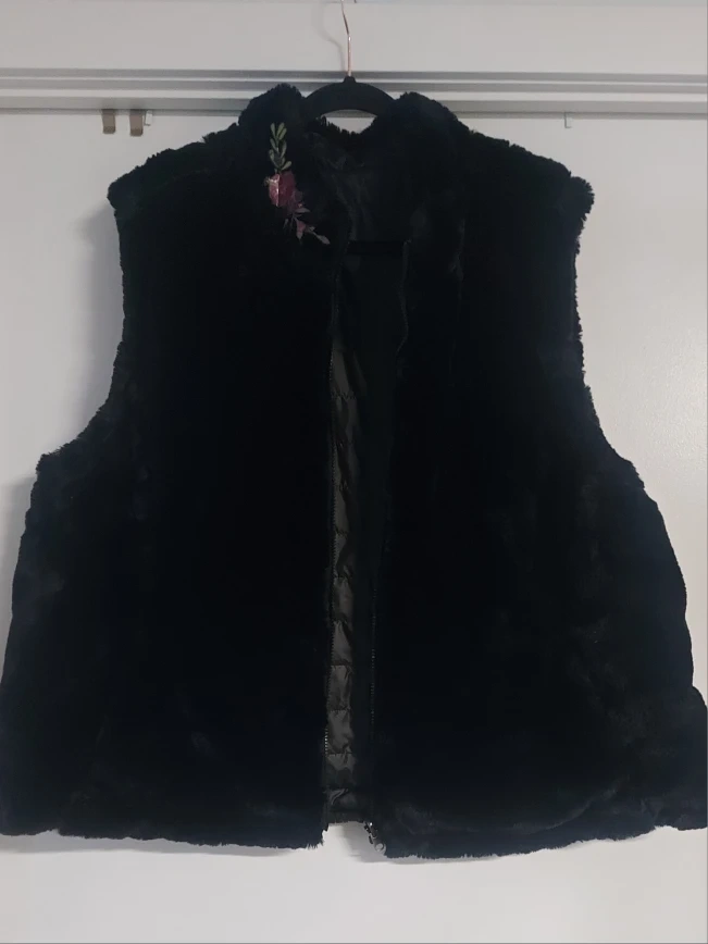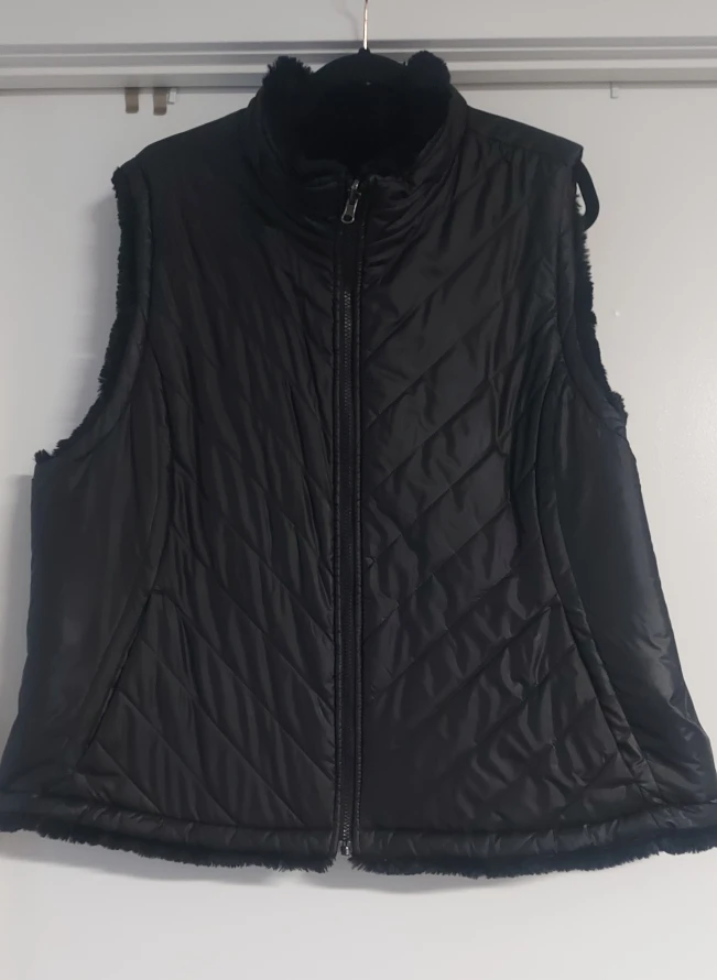 Here's a stylish black vest that's reversible! One side is quilted, and the other is a soft faux fur. Perfect for adding warmth and style to your outfit.