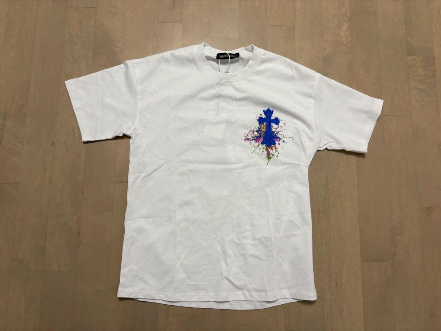 Selling a Chrome Hearts white t-shirt! It features a cool design on the back with a blue cross and colourful accents. It's in great condition and ready for a new owner