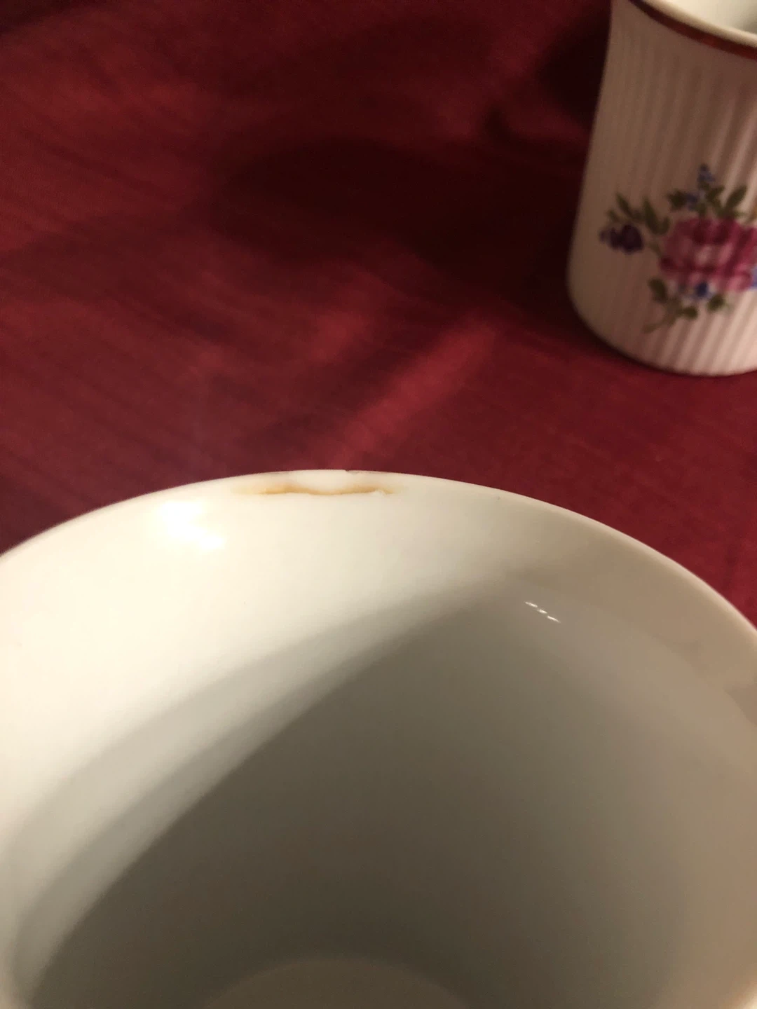 Selling a set of 4 JL MENAU vintage tea cups. They feature a floral design with a gold trim. There is a small mark on the rim of one of the mugs, as shown in the pictures.