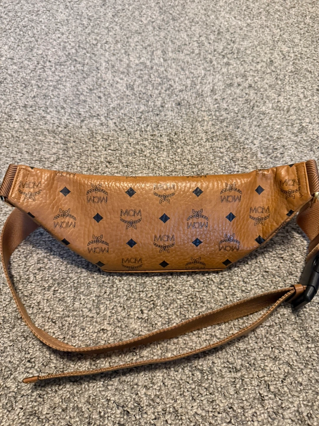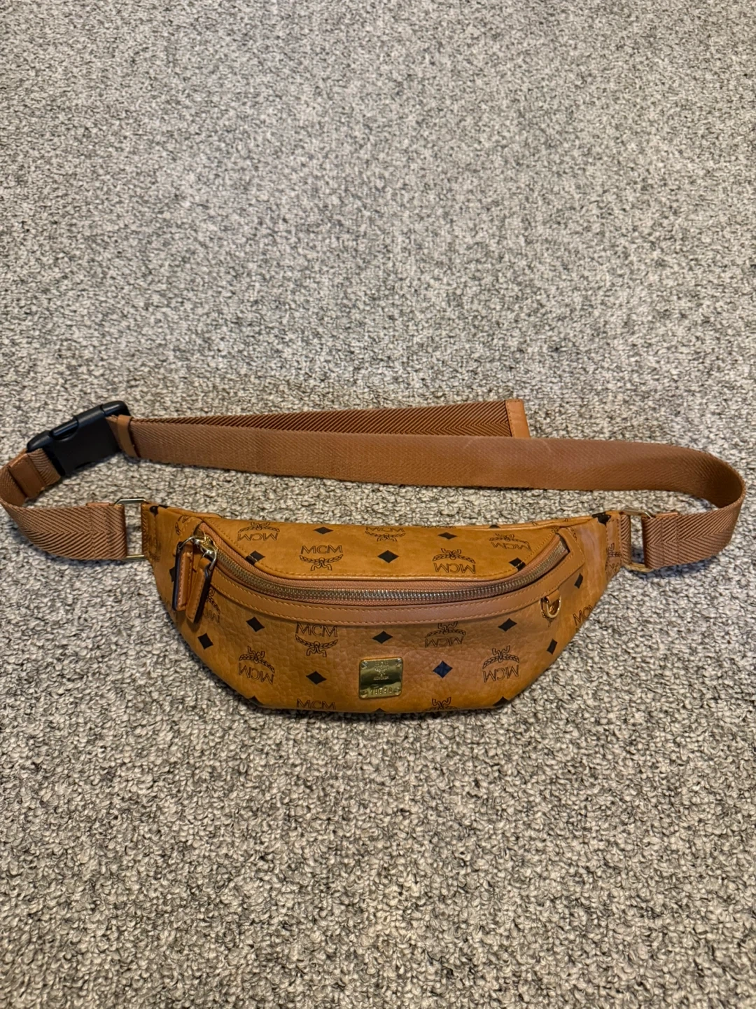 Selling a stylish MCM belt bag in cognac-coloured leather. It features the classic MCM logo pattern. Perfect for keeping your essentials close and adding a touch of luxury to your outfit!