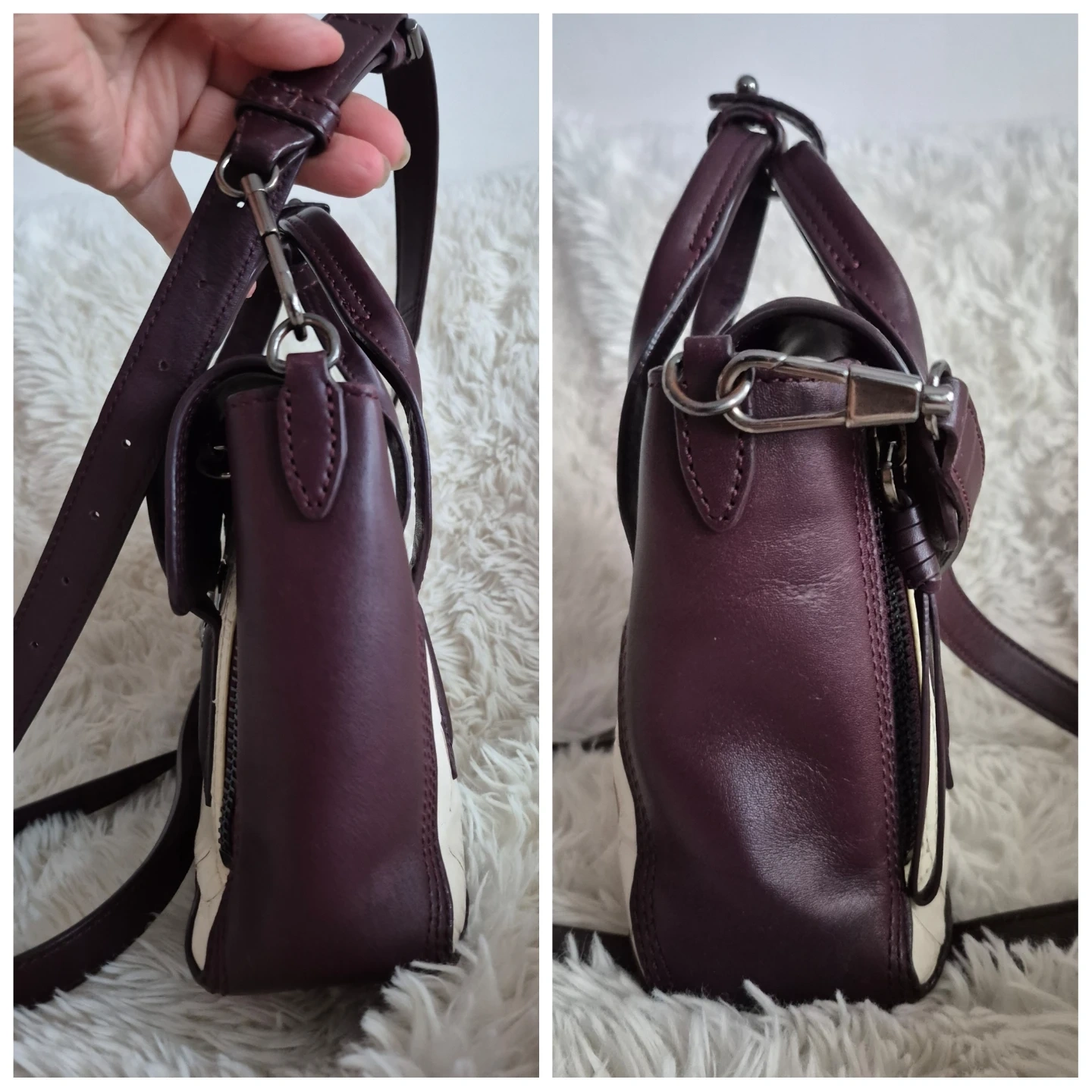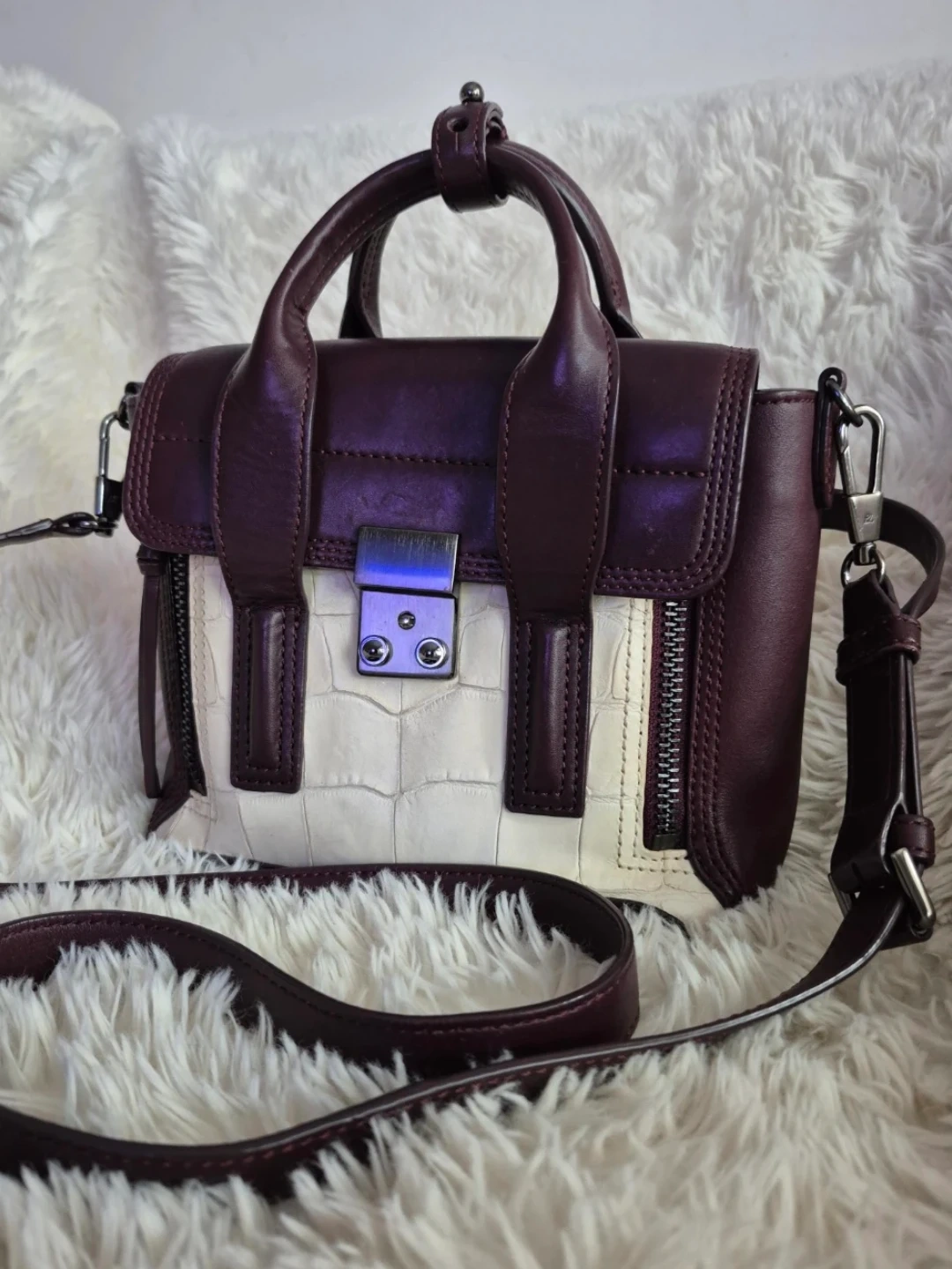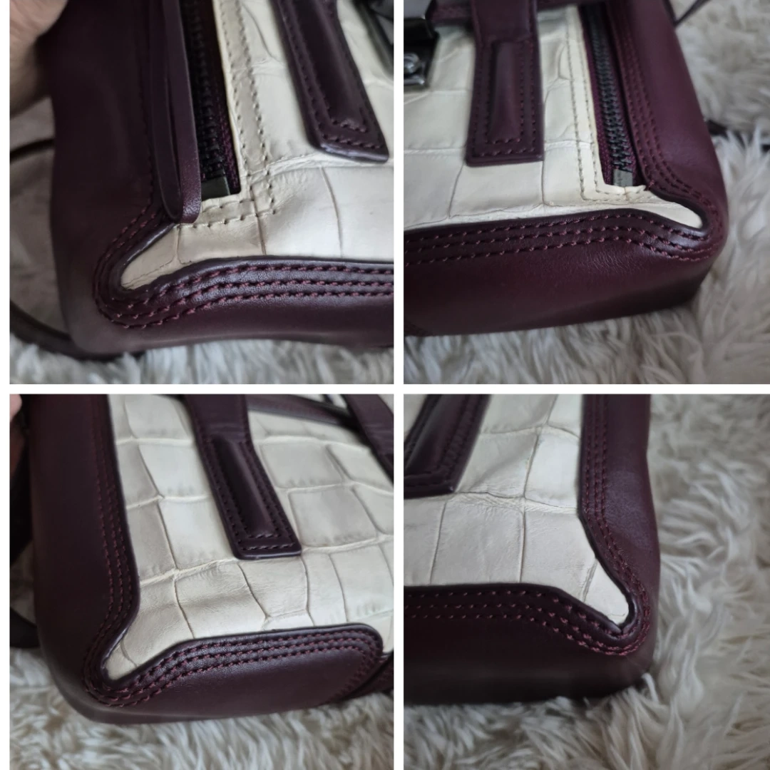 Festures: Two-tone design featuring a Burgundy/Aubergine textured calfskin leather and a White Crocodile-Embossed Leather front panel.