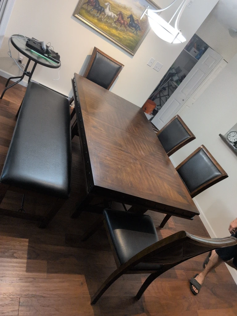 Selling a dining table with a bench and leather chairs. It's a great set for family meals or gatherings. The table has a sturdy hard wood and iron construction and a classic design that will fit well in any dining room. The leather chairs and bench have comfortable seating, making it a perfect spot to enjoy meals with family and friends. 7 seater with extension piece.