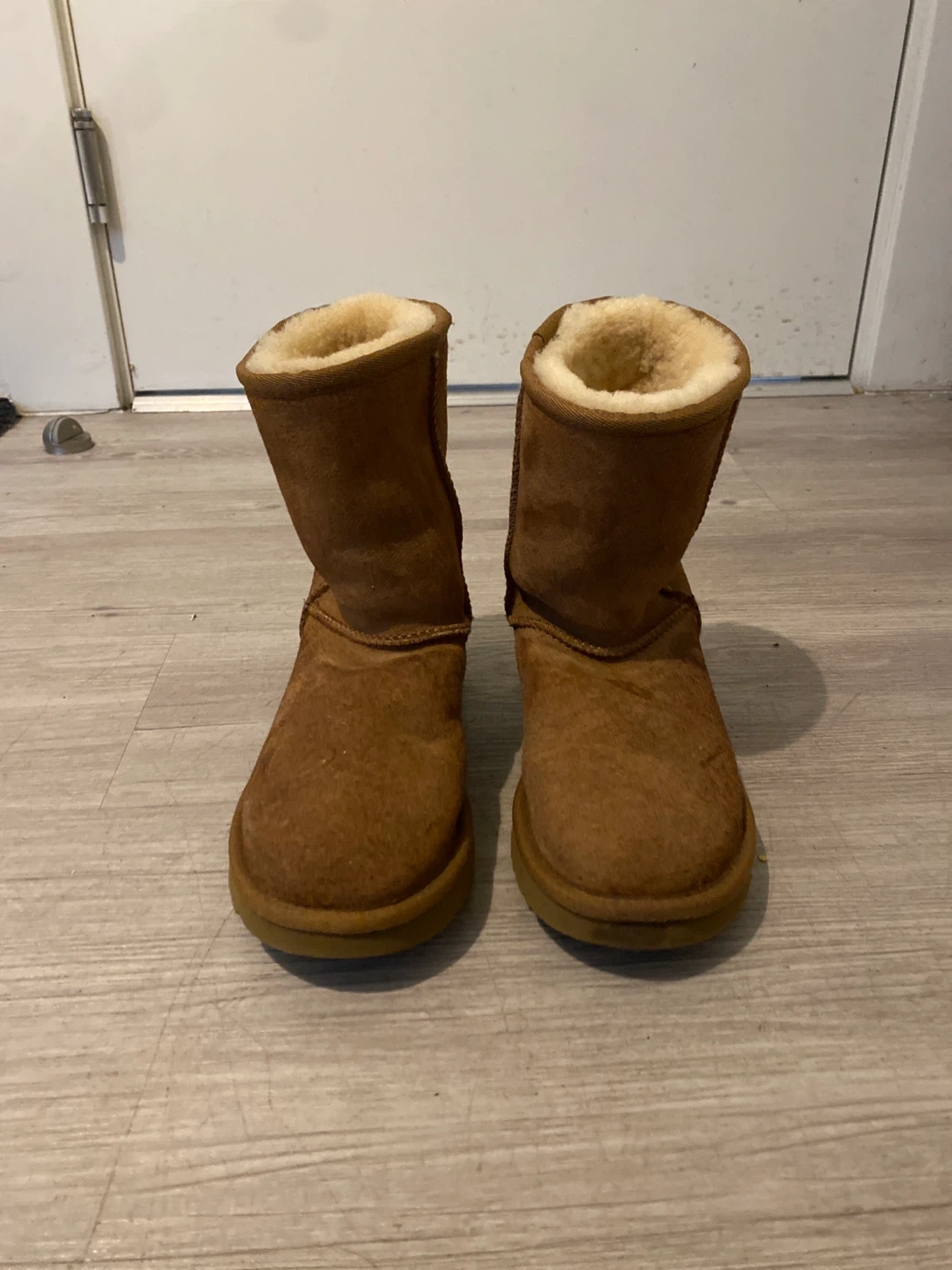Selling a pair of UGG Classic Mini boots in brown. They're in good condition and ready for a new owner! These are super comfy and great for everyday wear