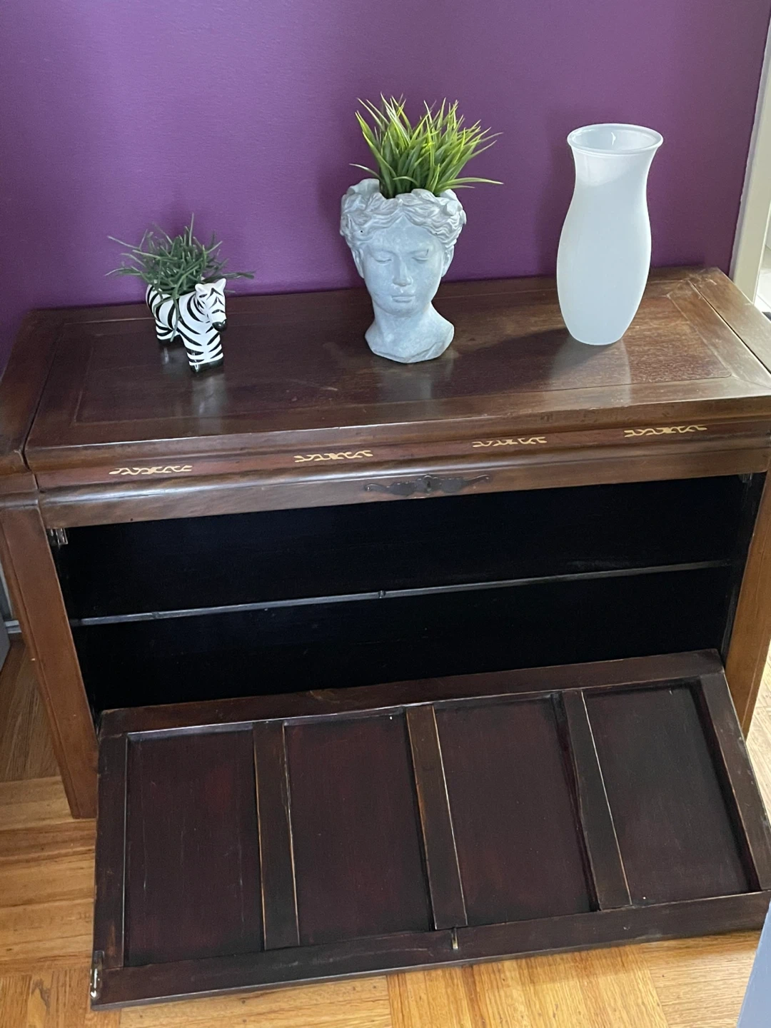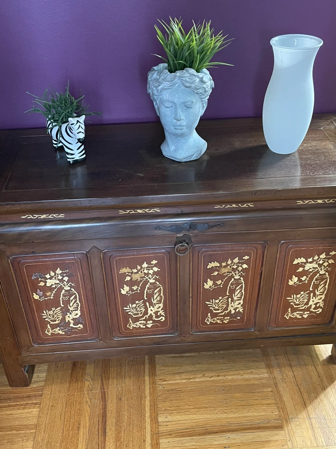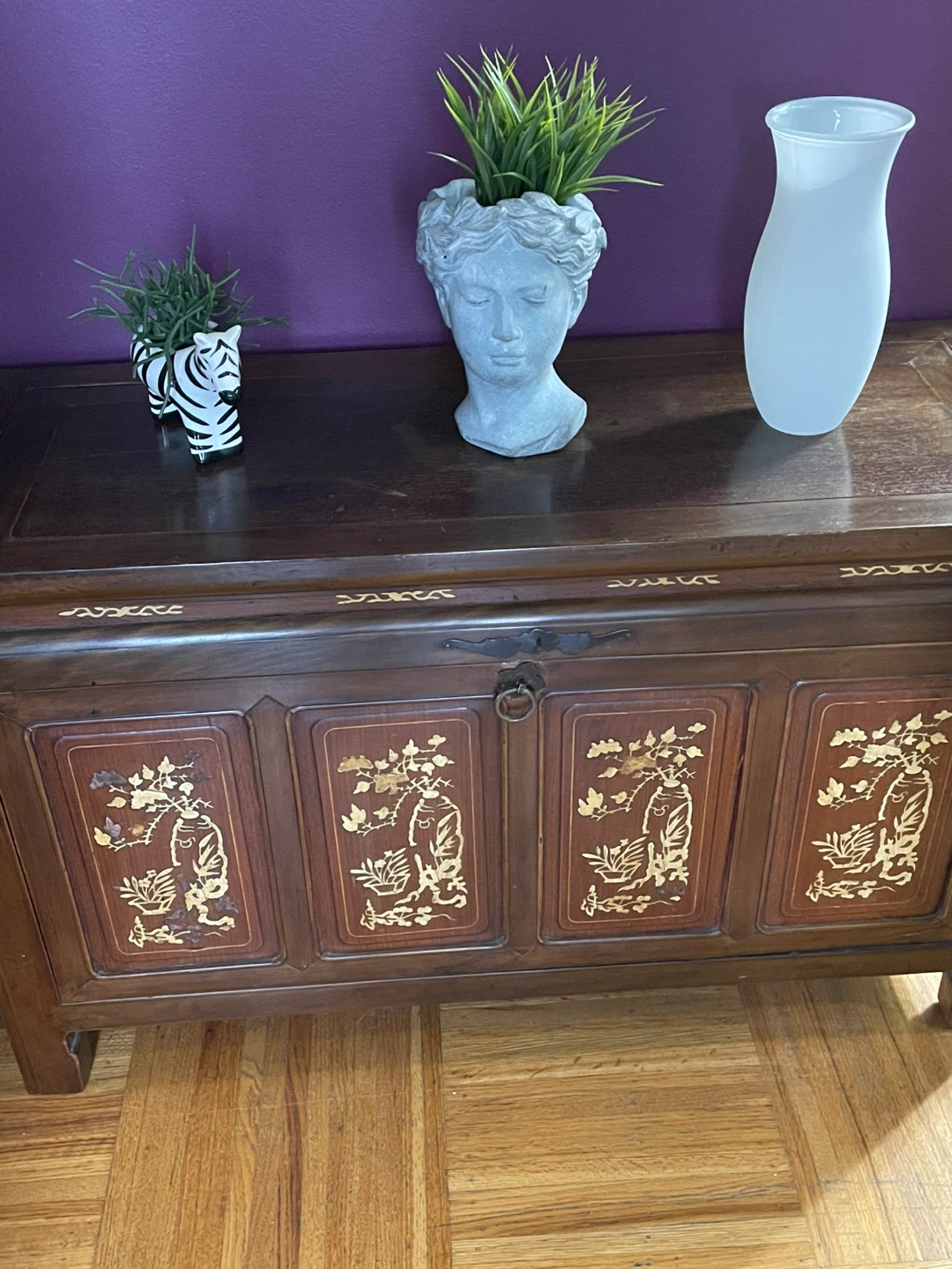 Selling a lovely wooden chest with unique gold detailing on the front panels. It's perfect for adding a touch of elegance to any room! It's in great condition and ready to be used for storage or as a decorative piece