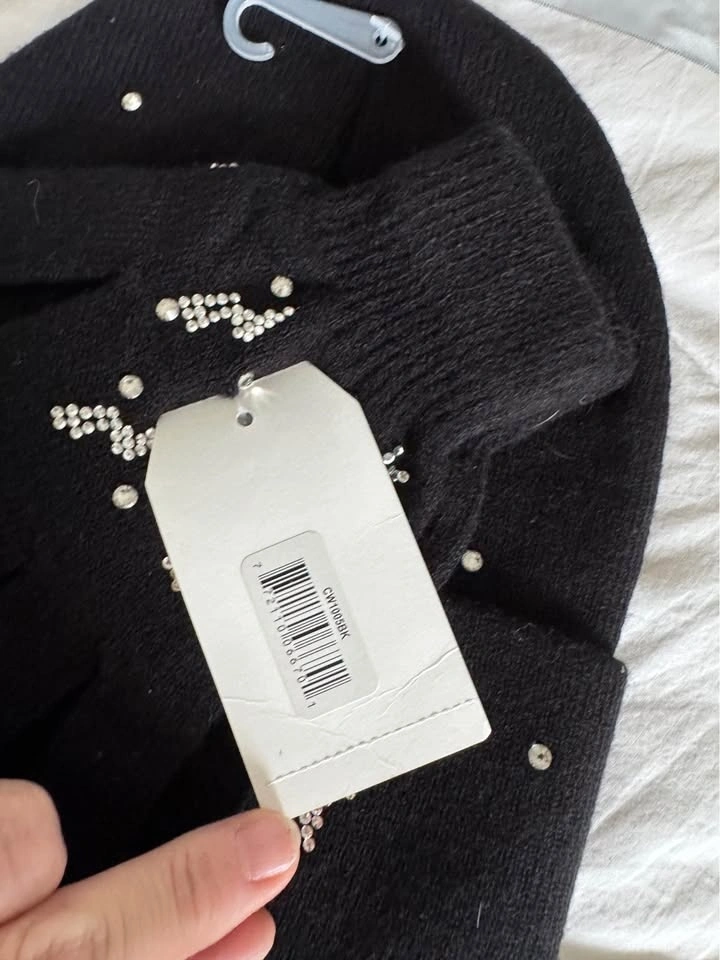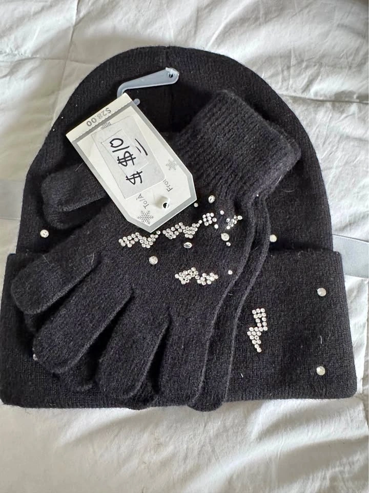 Brand New Ladies Black and Rhinestone Winter Hat and Gloves Gift Set for $10 New With Tags & Ribbon, Cleaning out my closet