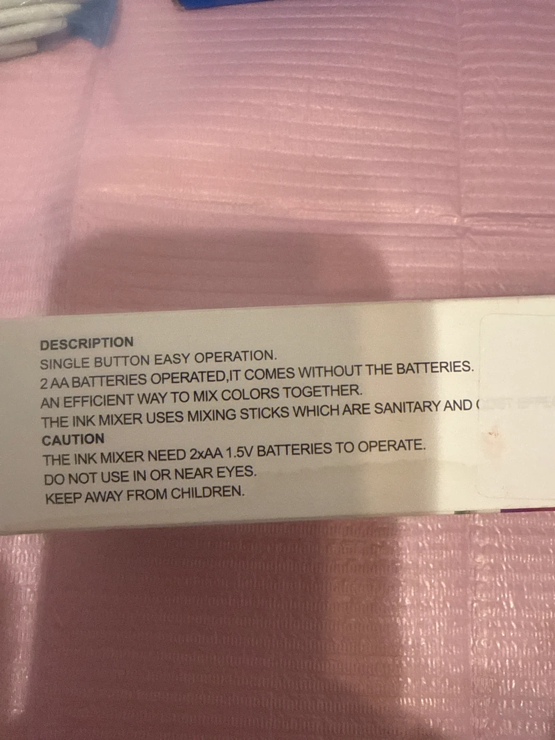 Selling an Ink Mixer. It features a single button for easy operation and efficiently mixes colors together. The ink mixer uses mixing sticks which are sanitary. Please note that it requires 2xAA 1.5V batteries to operate (batteries not included).