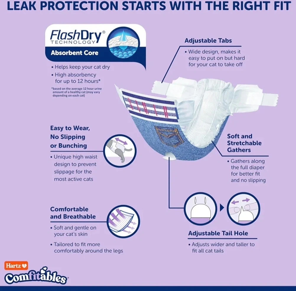 Keep your furry friend comfortable with these Comfitables cat diapers! They're designed for a comfortable fit that won't leak.