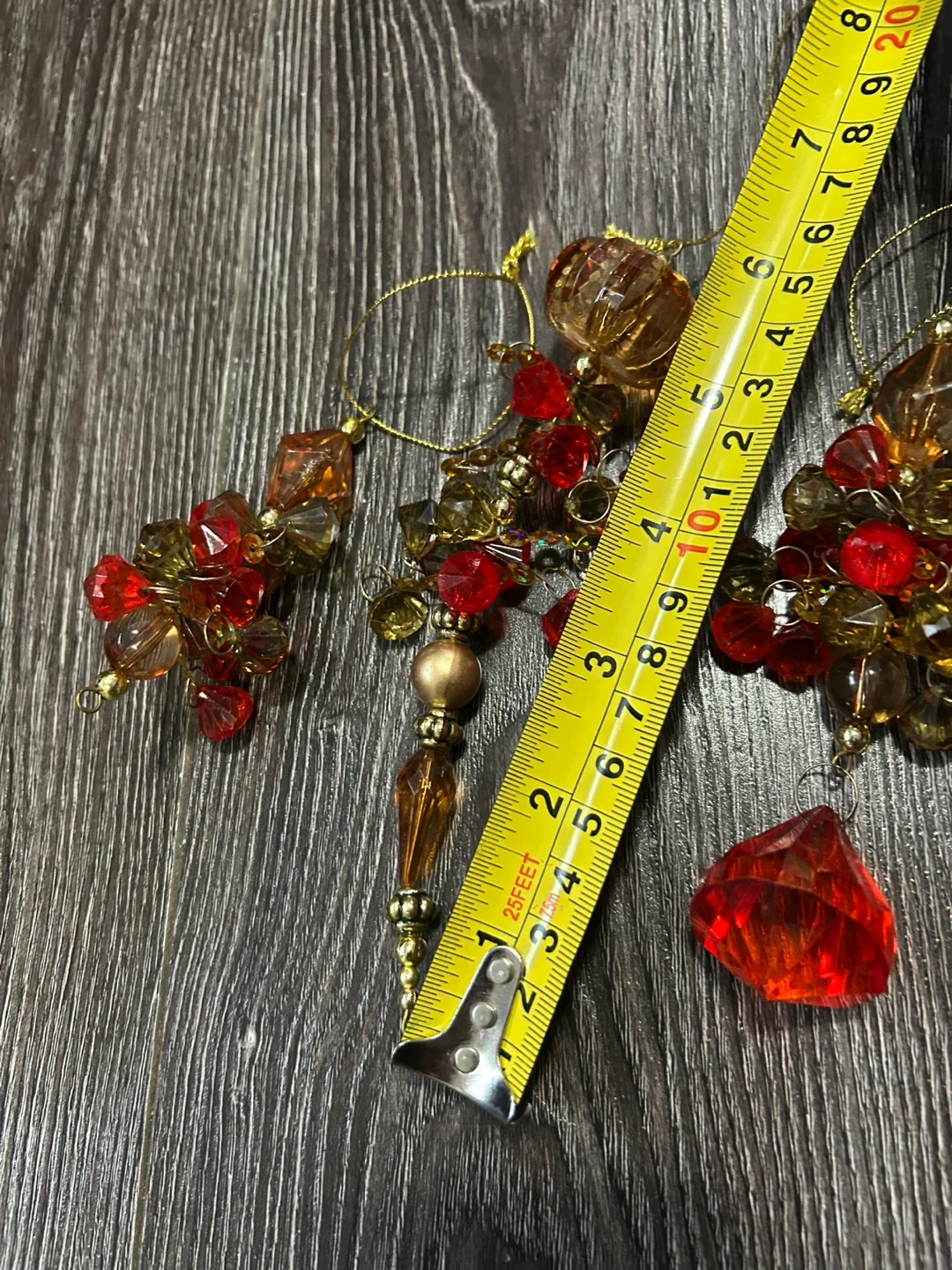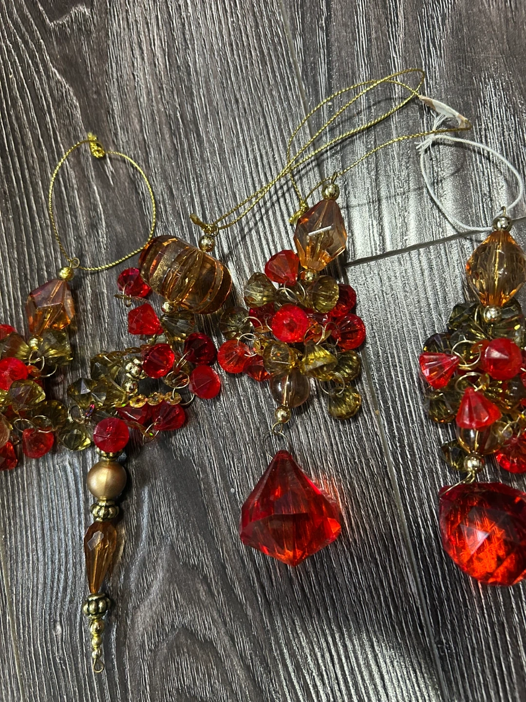 Here are some handmade beaded Christmas ornaments. They are red, gold, and brown. They are used but in still good condition.,The sizes vary, but they are approximately 4 to 6 inches in length. Must take all of them. No returns Pick up place is the A&W in 200st Langley.