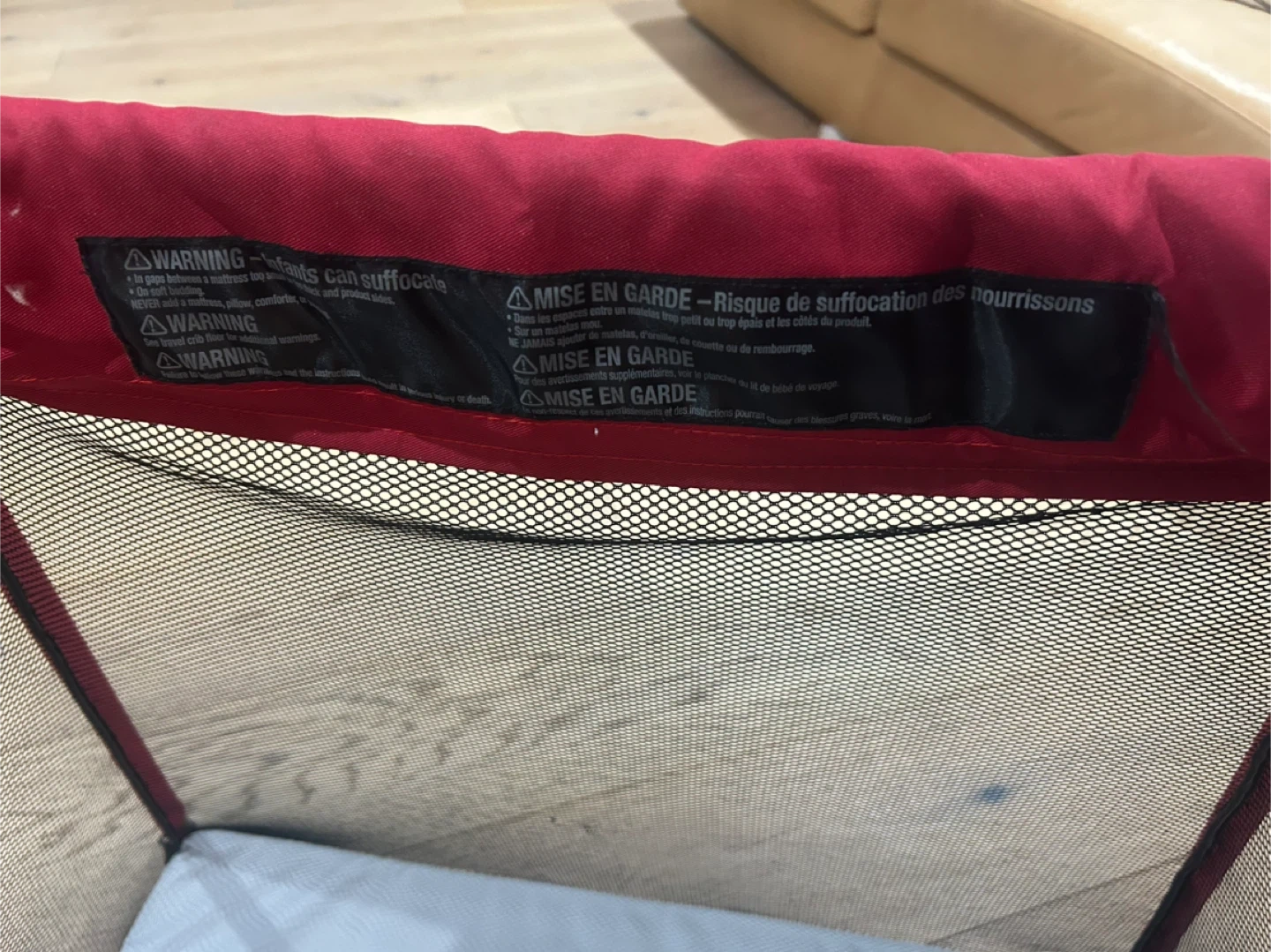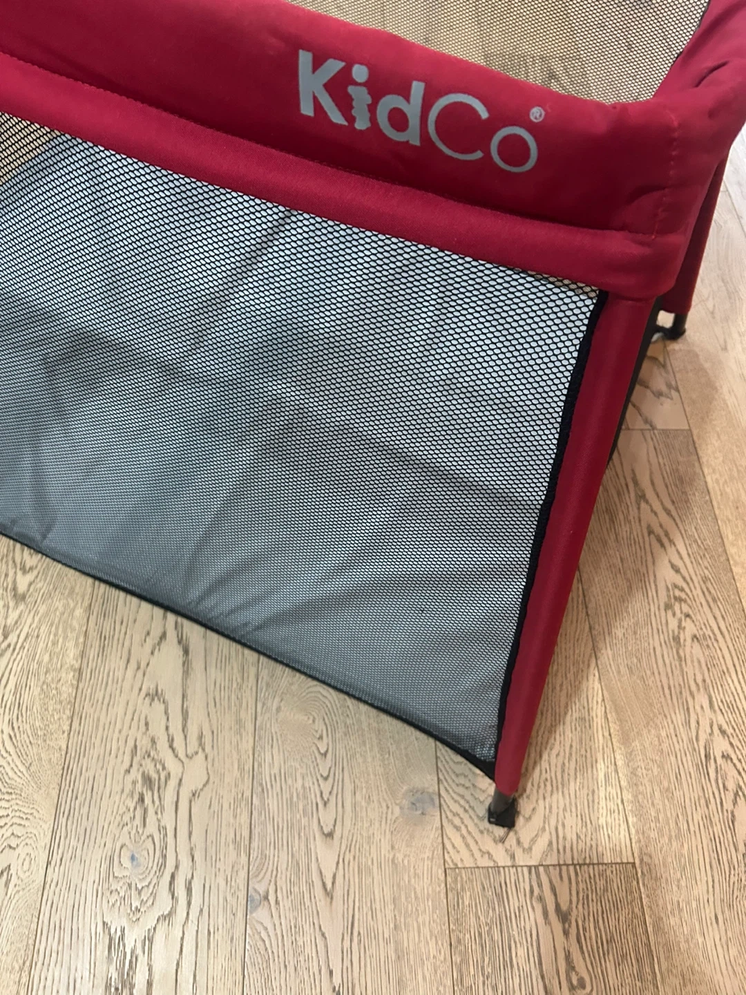 Selling a KidCo playard, perfect for travel or small spaces! It's in great condition and comes with its carrying case for easy storage and transport. The playard is red and black with mesh sides for visibility and breathability. It's lightweight and sets up quickly, making it ideal for visits to grandma's or camping trips with the little one