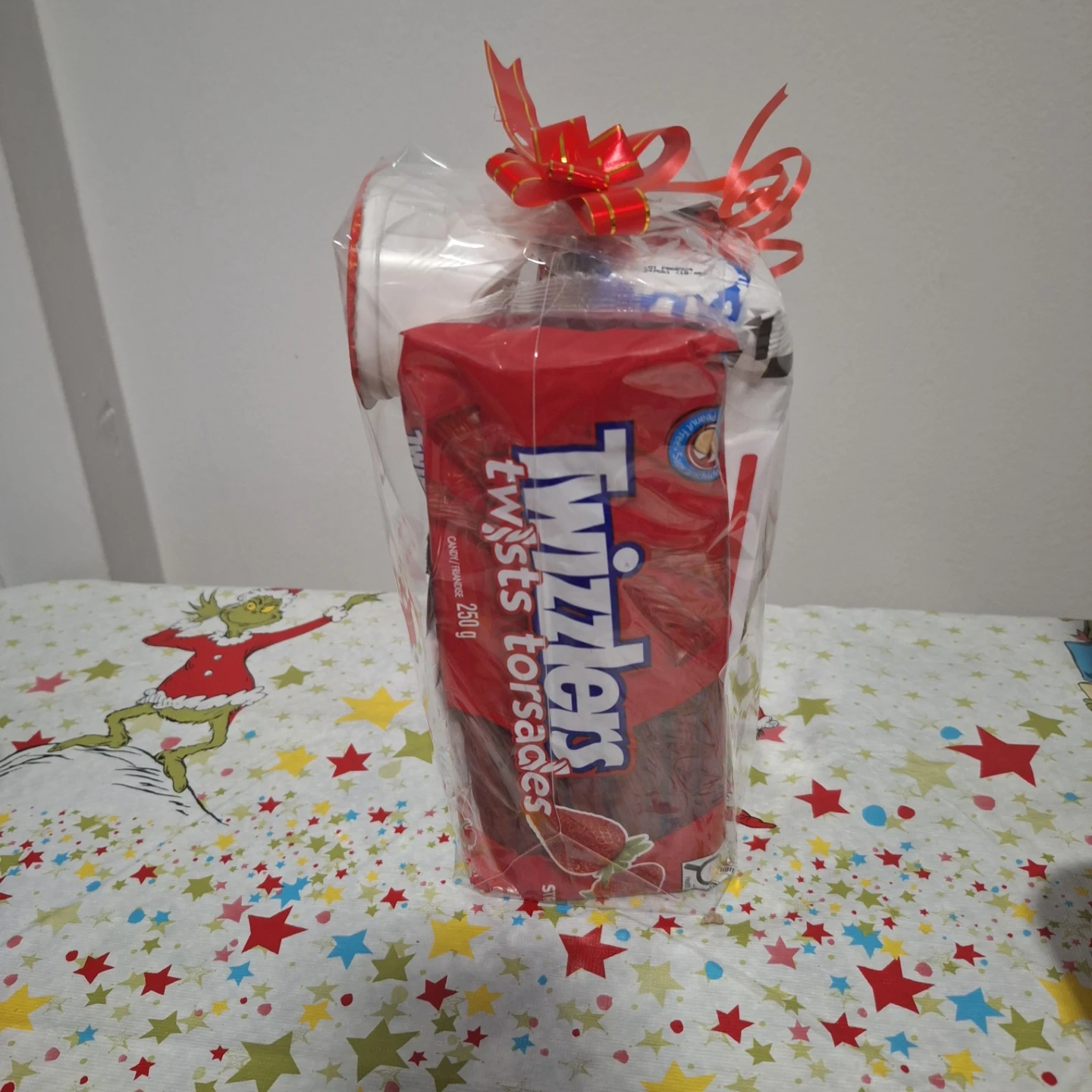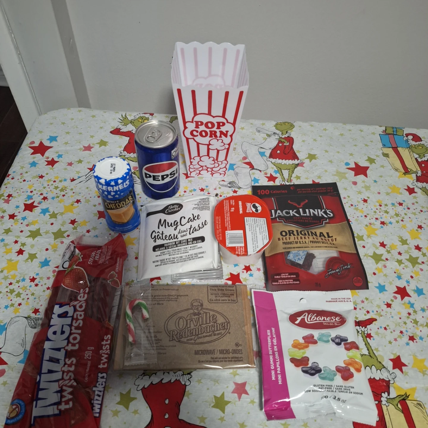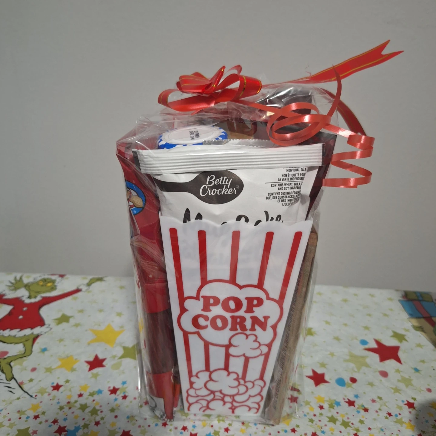 Selling a cute gift basket filled with a variety of treats! Inside you'll find Twizzlers twists, Pringles Original, Albanese mini gummy butterflies, Betty Crocker Mug Cake, and Orville Redenbacher microwave popcorn. Perfect for a little treat for yourself or a fun gift!