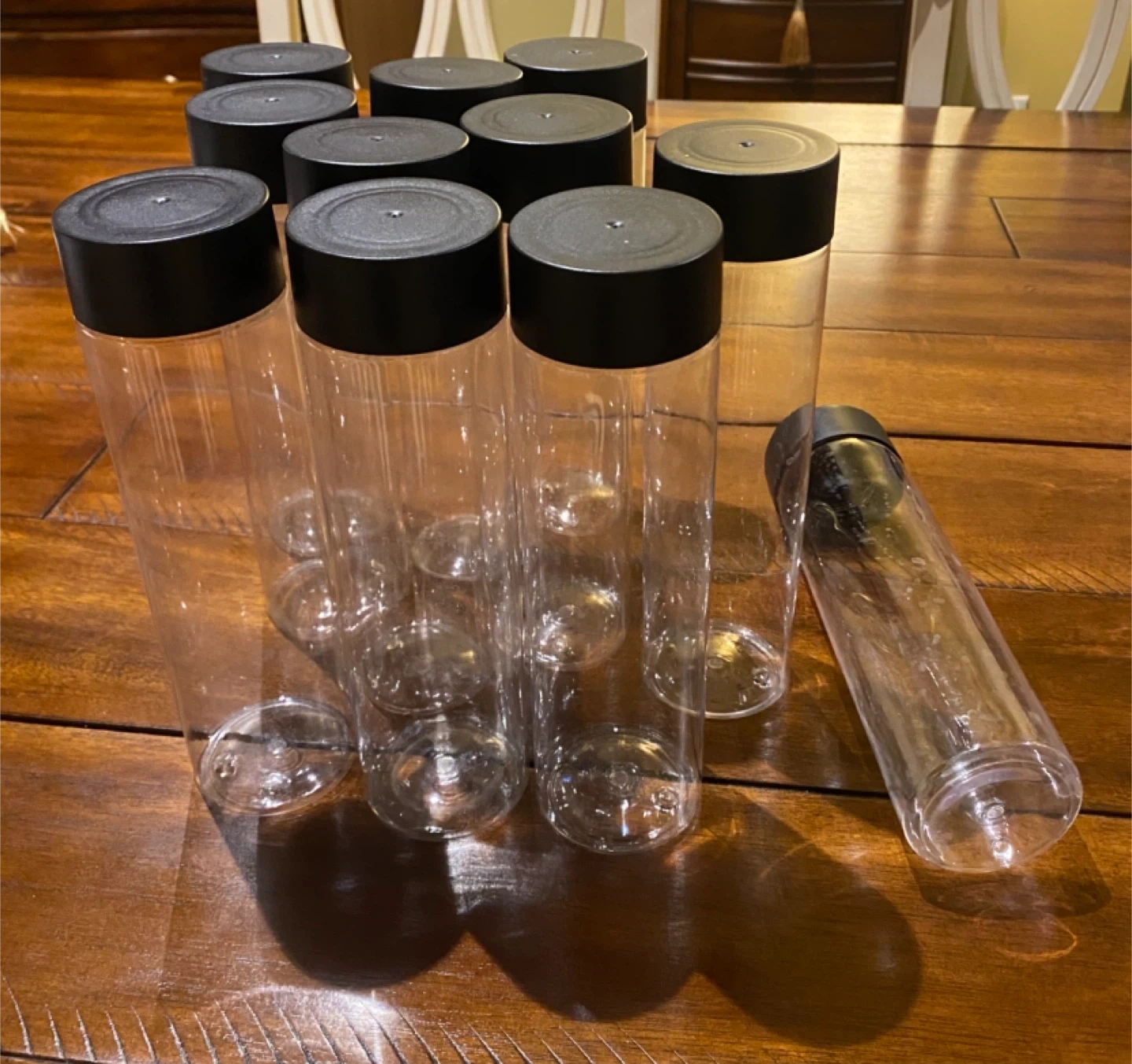 I have a set of 11 reusable clear plastic water bottles with black lids. They're in great condition and ready for your next adventure or daily hydration needs!