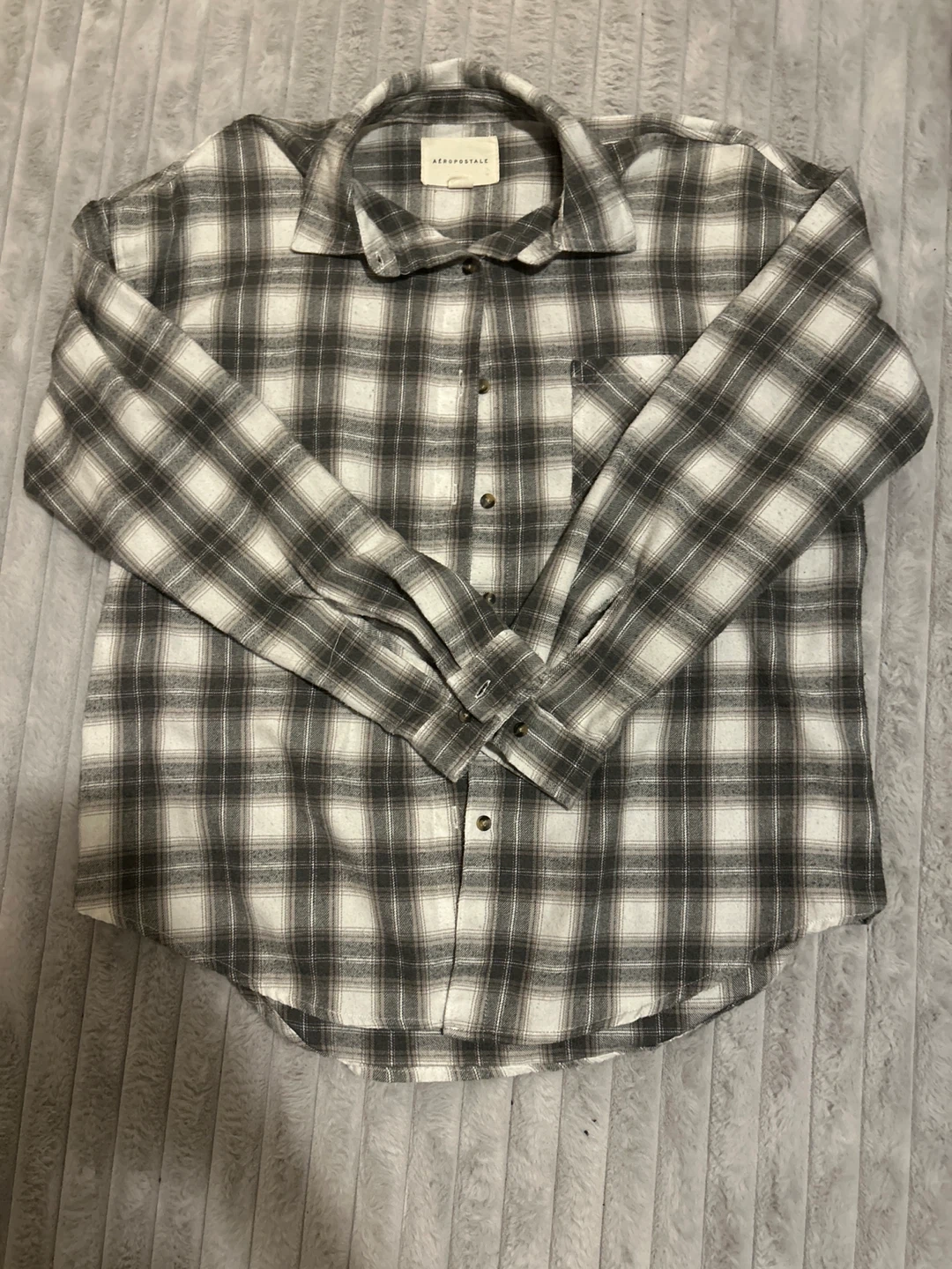 Here's a cozy Aeropostale plaid flannel shirt! It's in great shape and ready for cooler weather. The pattern is a classic plaid in neutral tones, perfect for layering or wearing on its own. It's a comfy and stylish addition to any wardrobe!