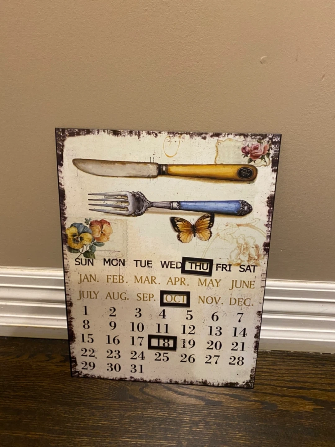 Here's a decorative piece of wall art featuring a calendar design! It showcases a vintage-style calendar with months and dates, alongside images of cutlery and floral accents. Perfect for adding a touch of charm to any room