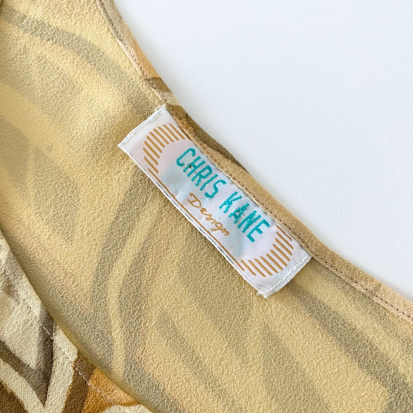 Vintage sleeveless blouse / tank. Made of lightweigh 100% silk in a yellow abstract print. Fully lined. Size, care + content labels have been removed.