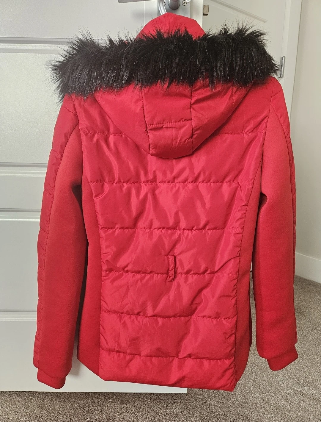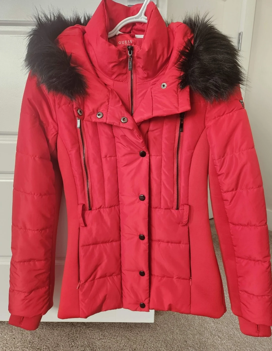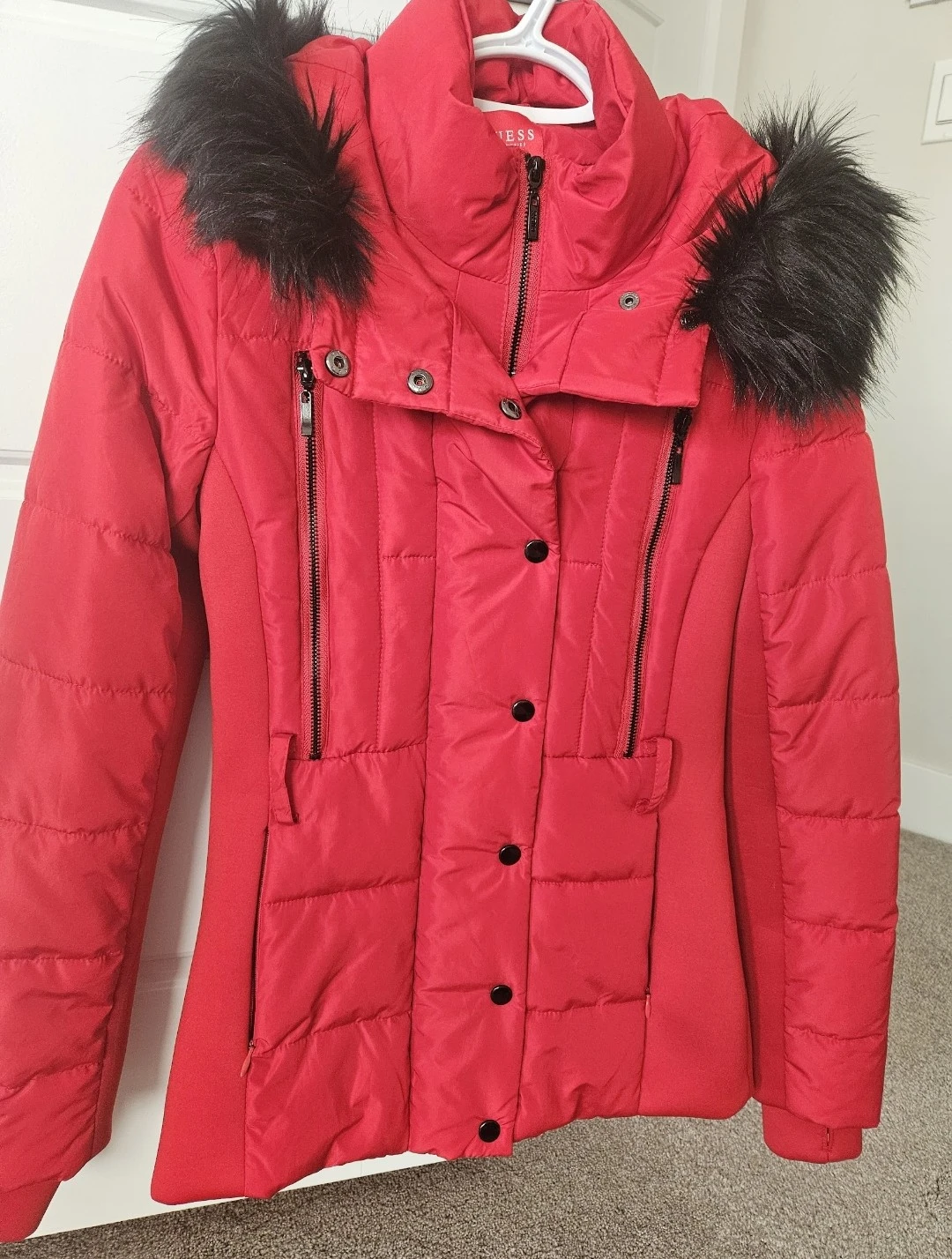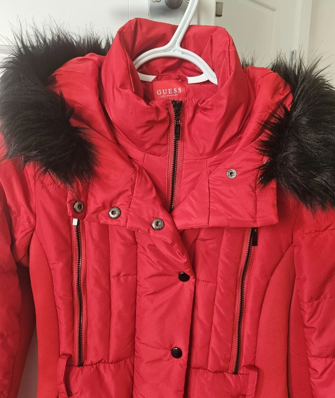 Guess puffer jacket in size XS. It's a vibrant red colour and features a faux fur trim on the hood. Great for staying warm and stylish during the colder months.